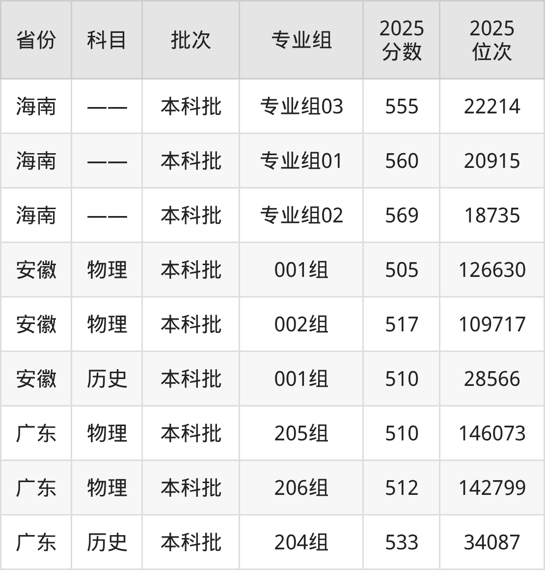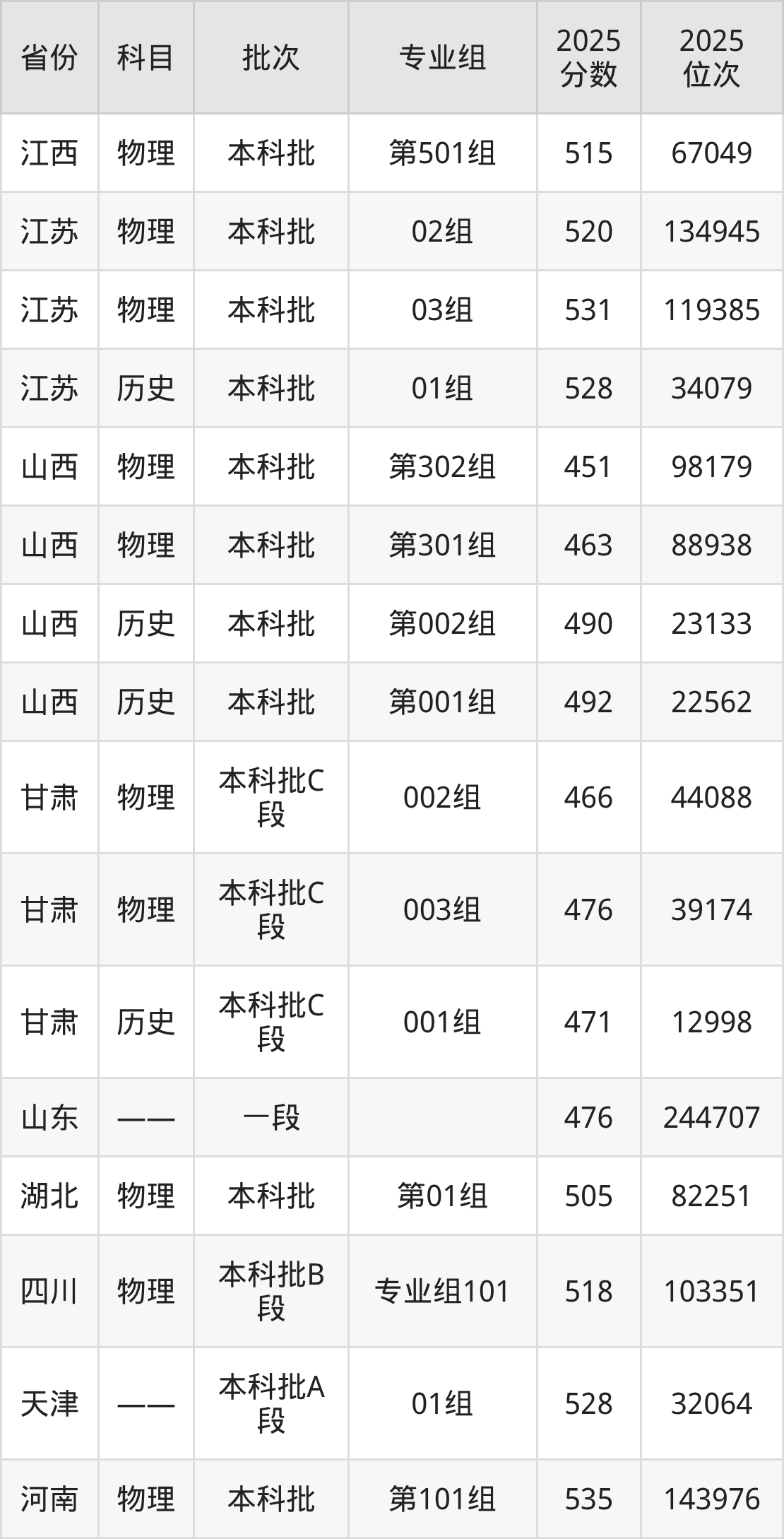 2025年在本科物理类进行招生,各专业组分数线详情如下:
