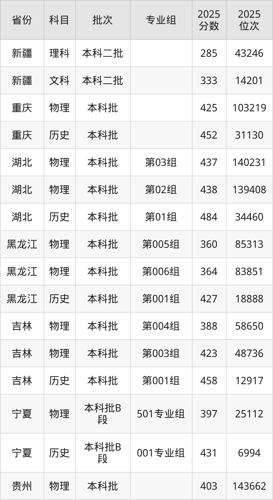 2025年投档录取最低分为285分,录取最低位次为43246名。