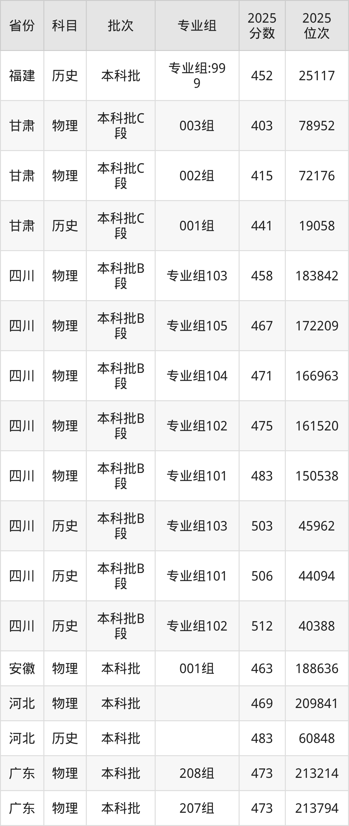 2025年投档录取最低分为452分,录取最低位次为31130名。
