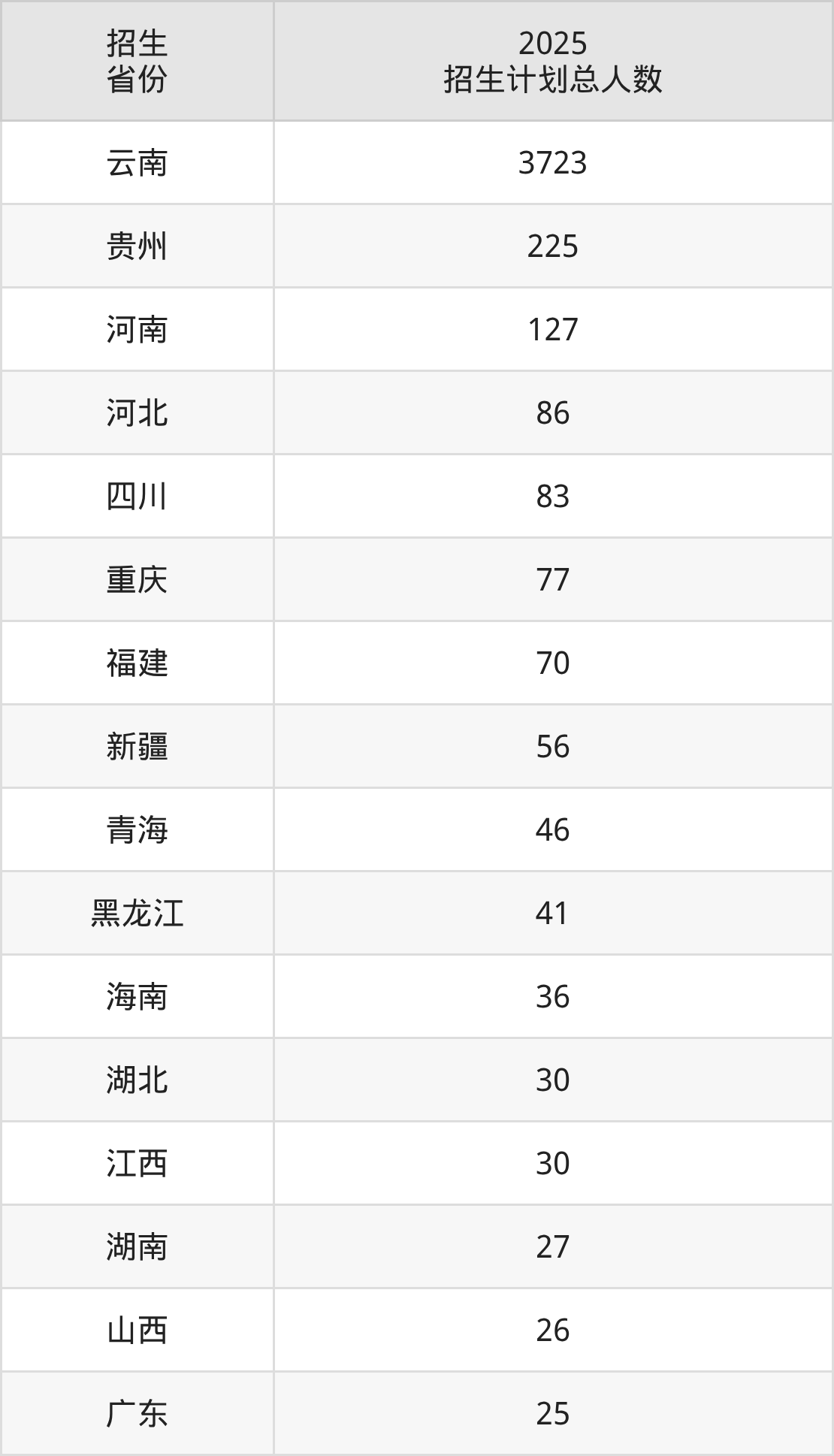 2025年云南经济管理学院面向全国23个省市开展本科招生;招生专业共39个,招生人数共2559人。2025年在云南省招生计划总人数是3723人,其中,云南经济管理学院在云南省招生人数最多的是电气工程及其自动化。云南经济管理学院在各省具体招生人数情况如下表。