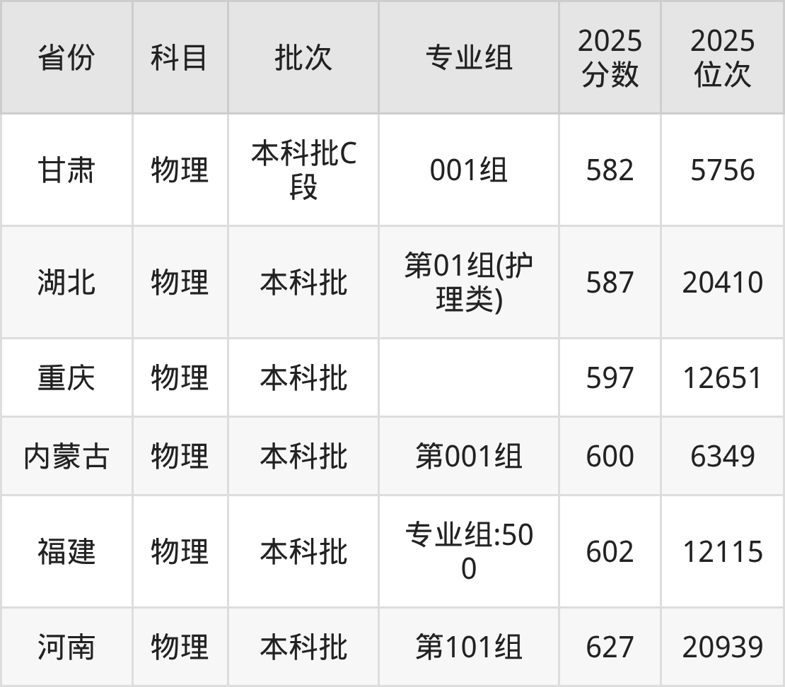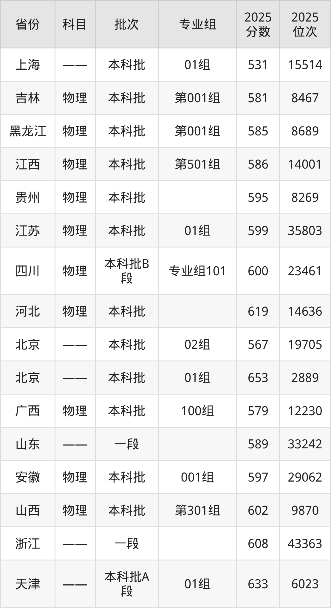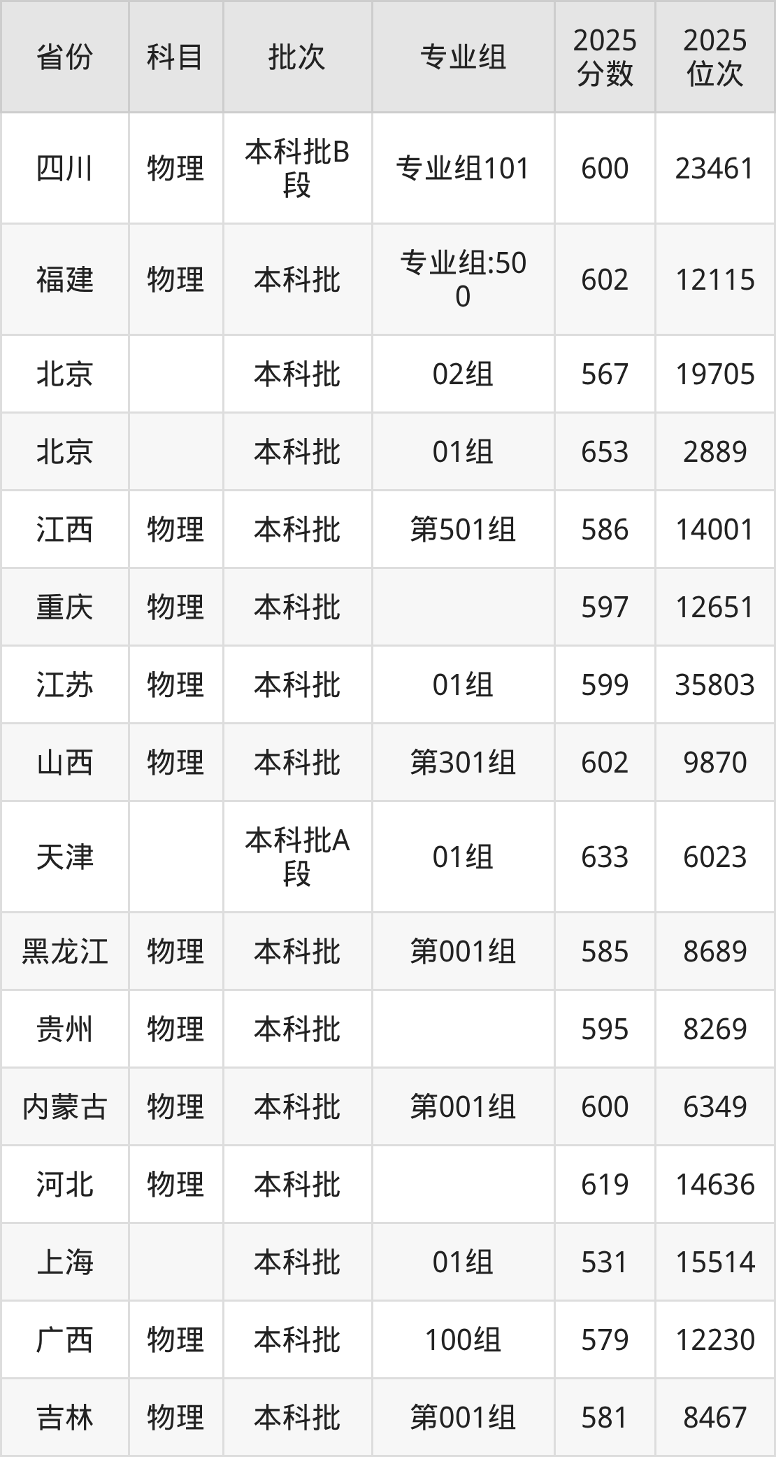 2025年在本科物理类进行招生,各专业组分数线详情如下: