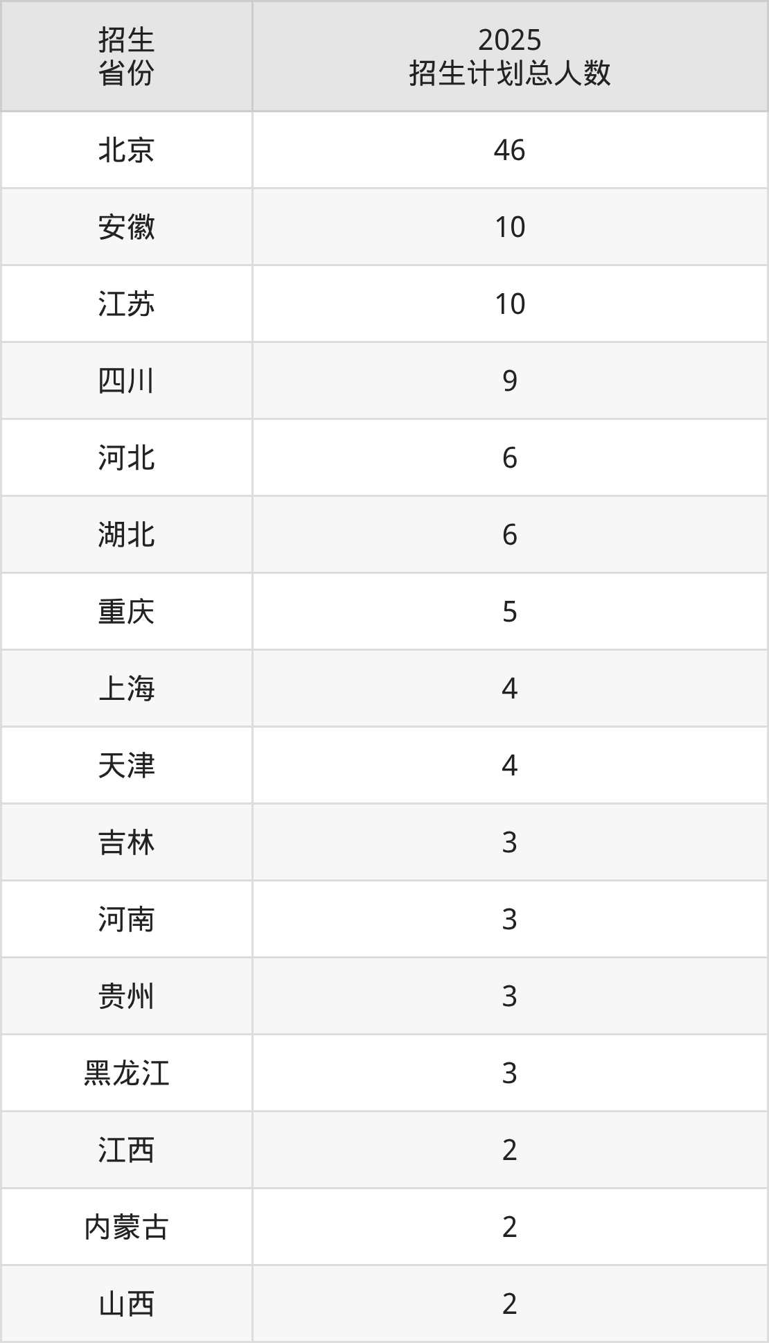 2025年北京协和医学院面向全国20个省市开展本科招生;招生专业共2个,招生人数共126人。2025年在北京市招生计划总人数是46人,其中,北京协和医学院在北京市招生人数最多的是护理学。北京协和医学院在各省具体招生人数情况如下表。