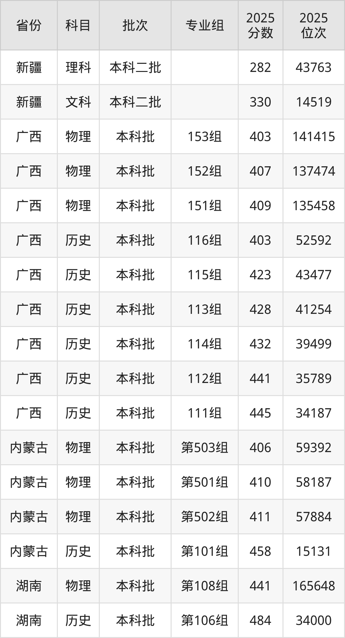 2025年投档录取最低分为282分,录取最低位次为43763名。