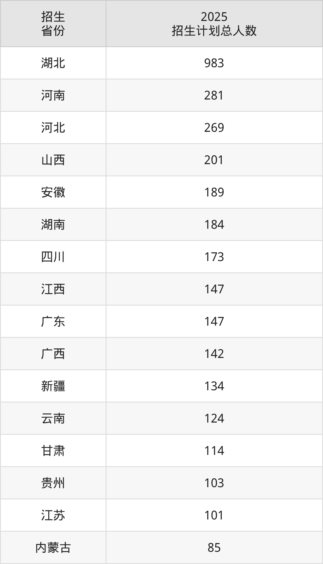 2025年中国地质大学(武汉)面向全国28个省市开展本科招生;招生专业共45个,招生人数共3994人。2025年在湖北省招生计划总人数是983人,其中,中国地质大学(武汉)在湖北省招生人数最多的是计算机类。中国地质大学(武汉)在各省具体招生人数情况如下表。