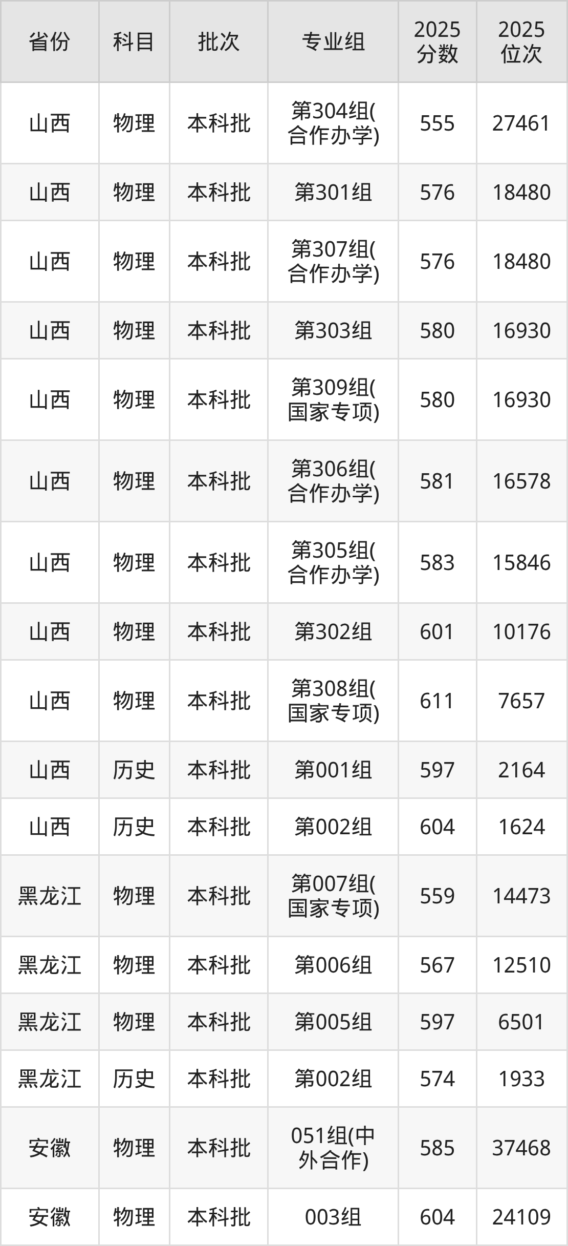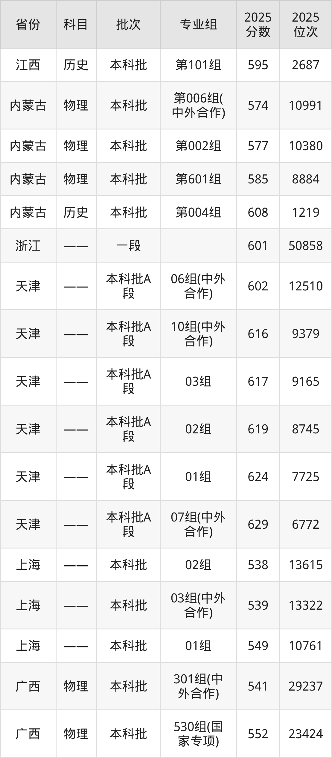 中国地质大学(武汉)301组(中外合作):2025年投档录取最低分为541分,录取最低位次为29237名。
