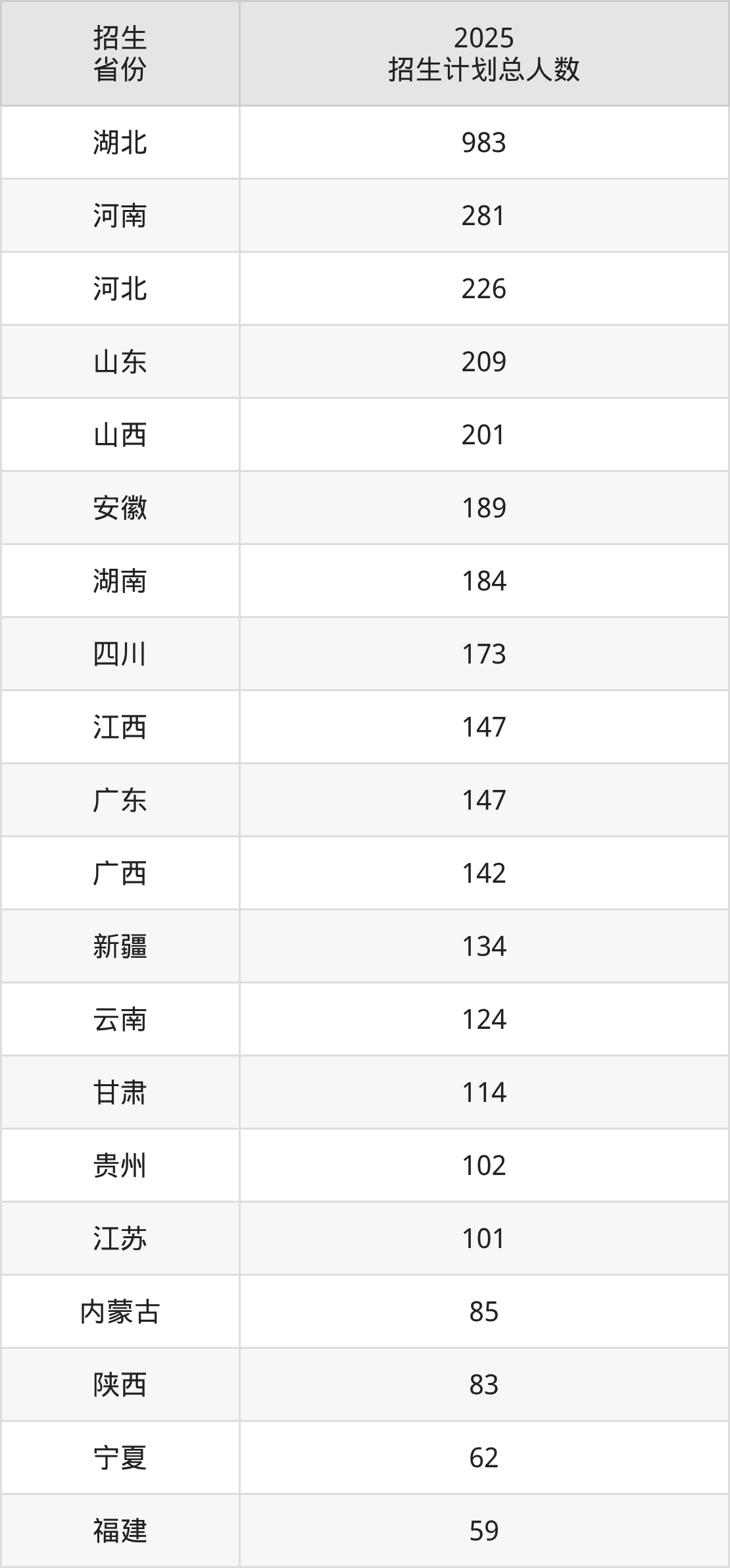 2025年中国地质大学(武汉)面向全国29个省市开展本科招生;招生专业共44个,招生人数共4145人。2025年在湖北省招生计划总人数是983人,其中,中国地质大学(武汉)在湖北省招生人数最多的是计算机类。中国地质大学(武汉)在各省具体招生人数情况如下表。