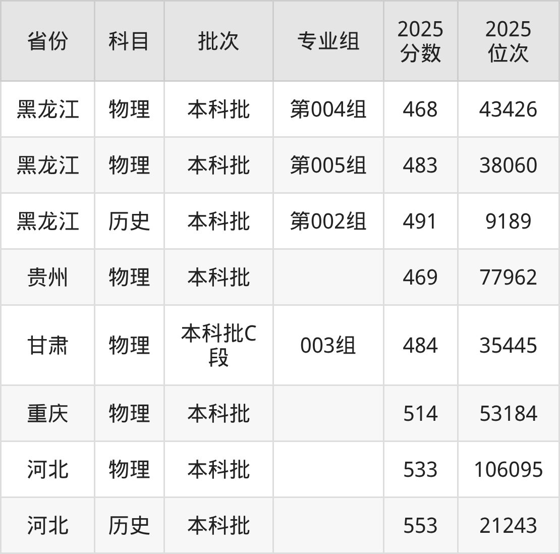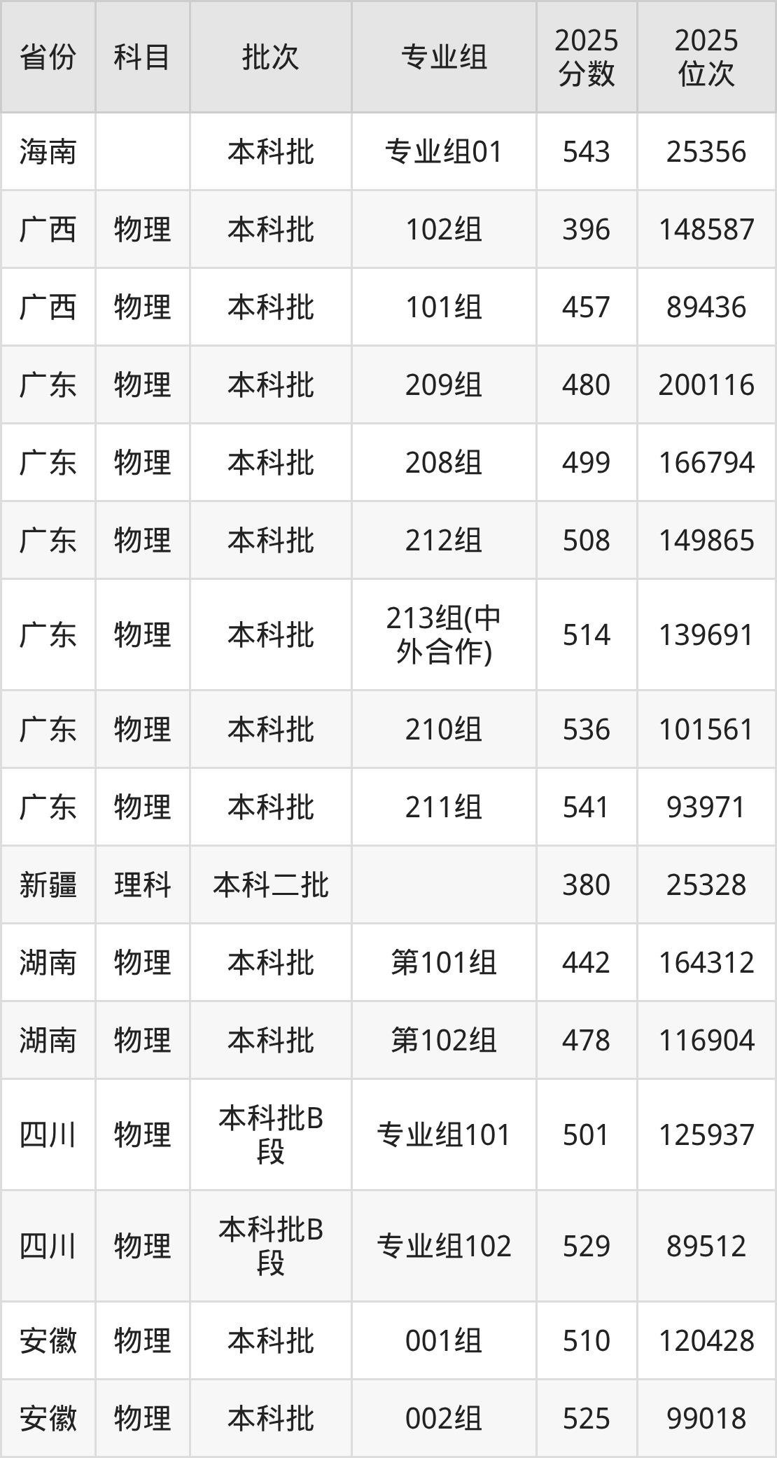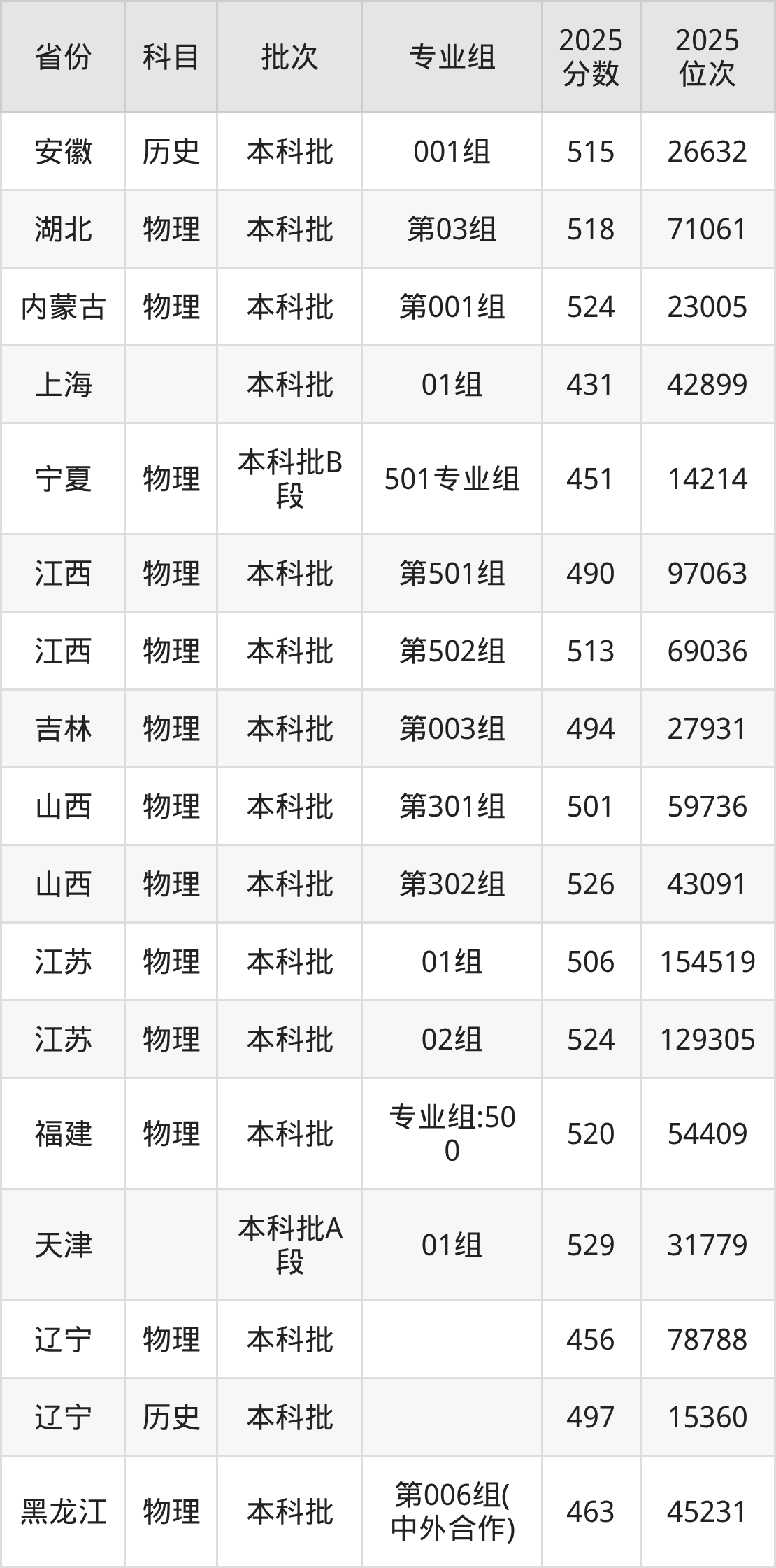 2025年在本科物理类进行招生,各专业组分数线详情如下: