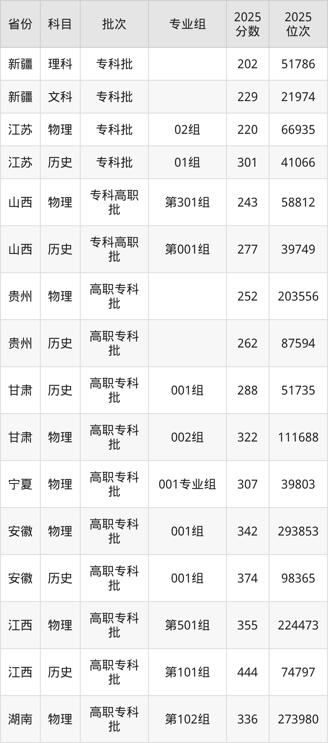 普通类专科物理类最低342分,专科历史类最低374分