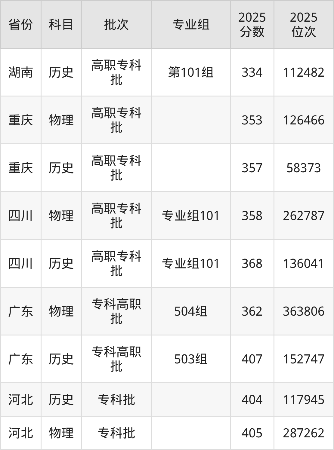 专科历史类投档录取最低404分,专科物理类投档录取最低405分