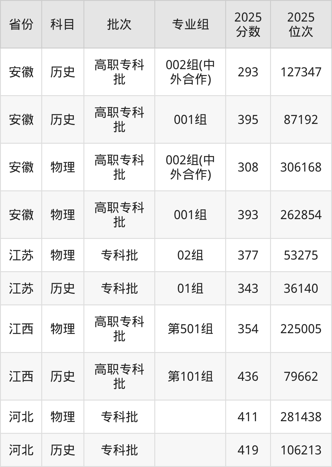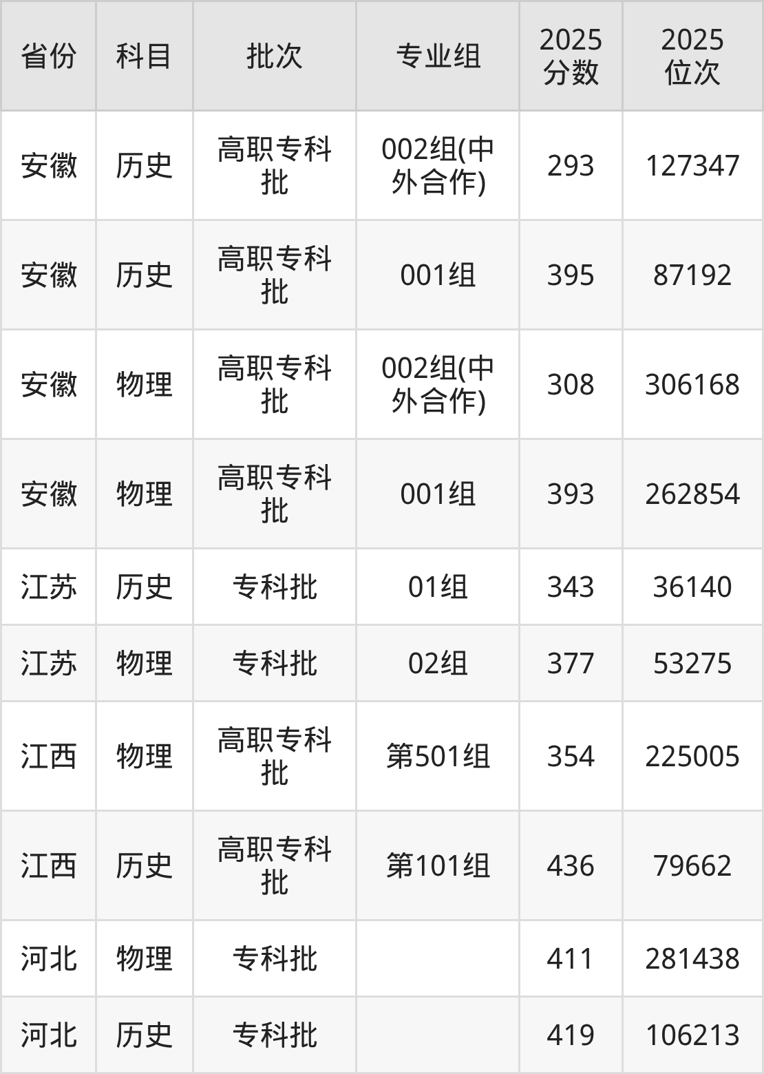 2025年滁州城市职业学院全国录取分数线是293分到436分,录取最低在安徽历史类(002组(中外合作))、录取最高在江西历史类(第101组)。各省各专业组最低分具有差异,详情如下:
