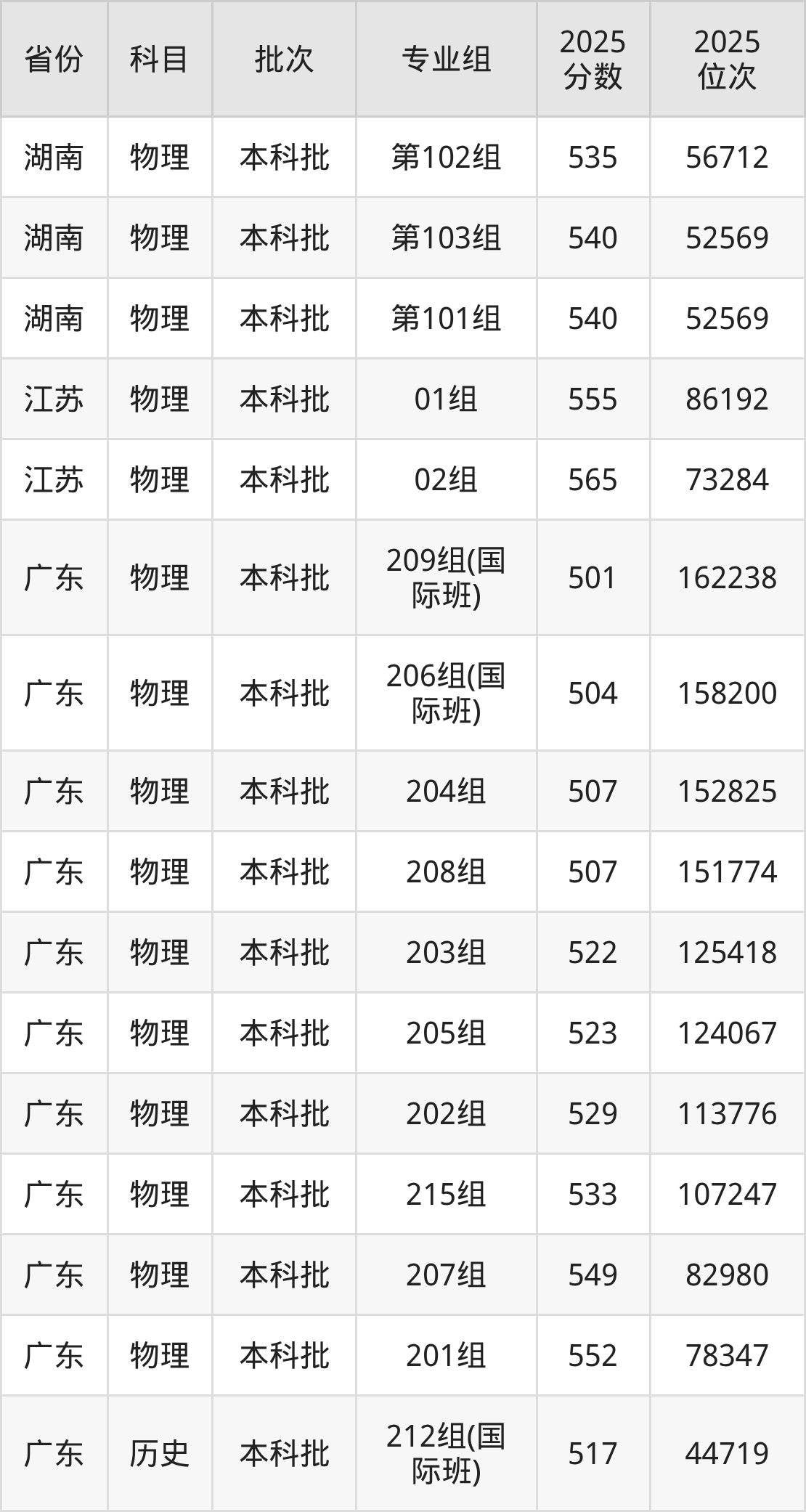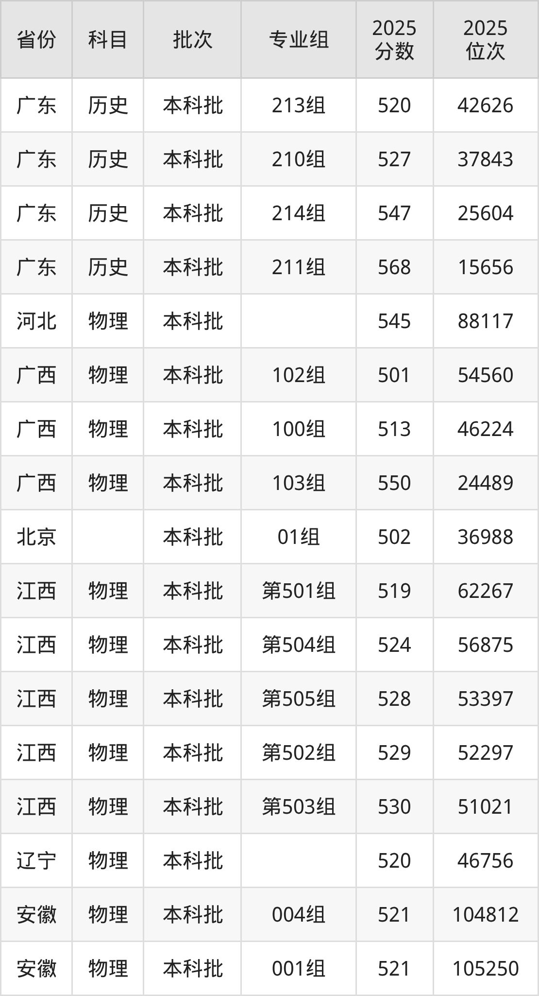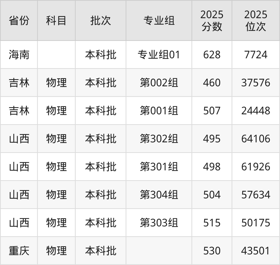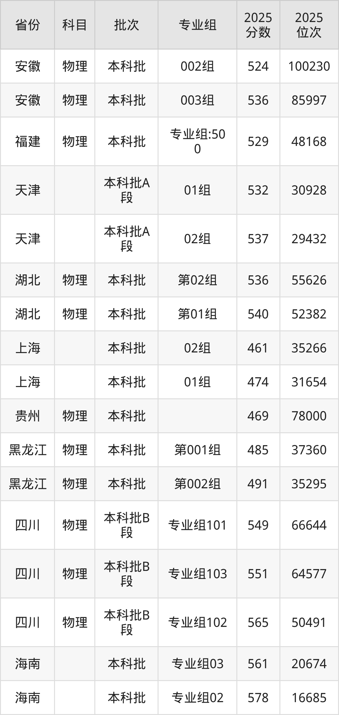 2025年在本科物理类进行招生,各专业组分数线详情如下:
