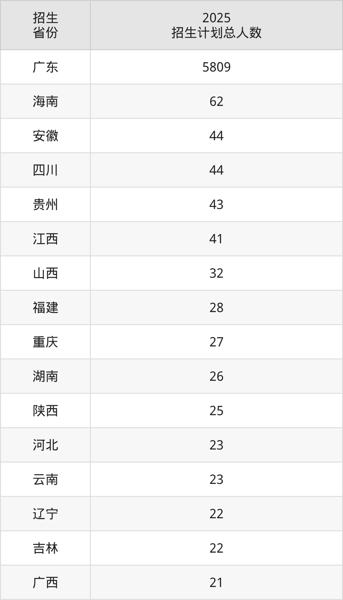 2025年广东药科大学面向全国23个省市开展本科招生;招生专业共45个,招生人数共6404人。2025年在广东省招生计划总人数是5809人,其中,广东药科大学在广东省招生人数最多的是中药学。广东药科大学在各省具体招生人数情况如下表。