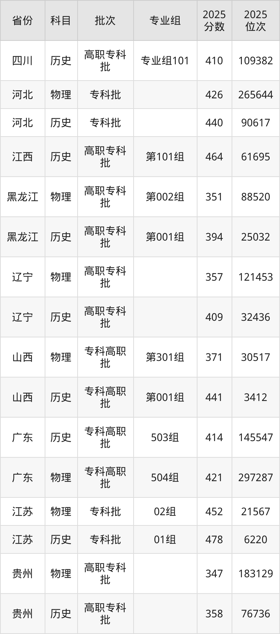 2025年在专科历史类进行招生,各专业组分数线详情如下: