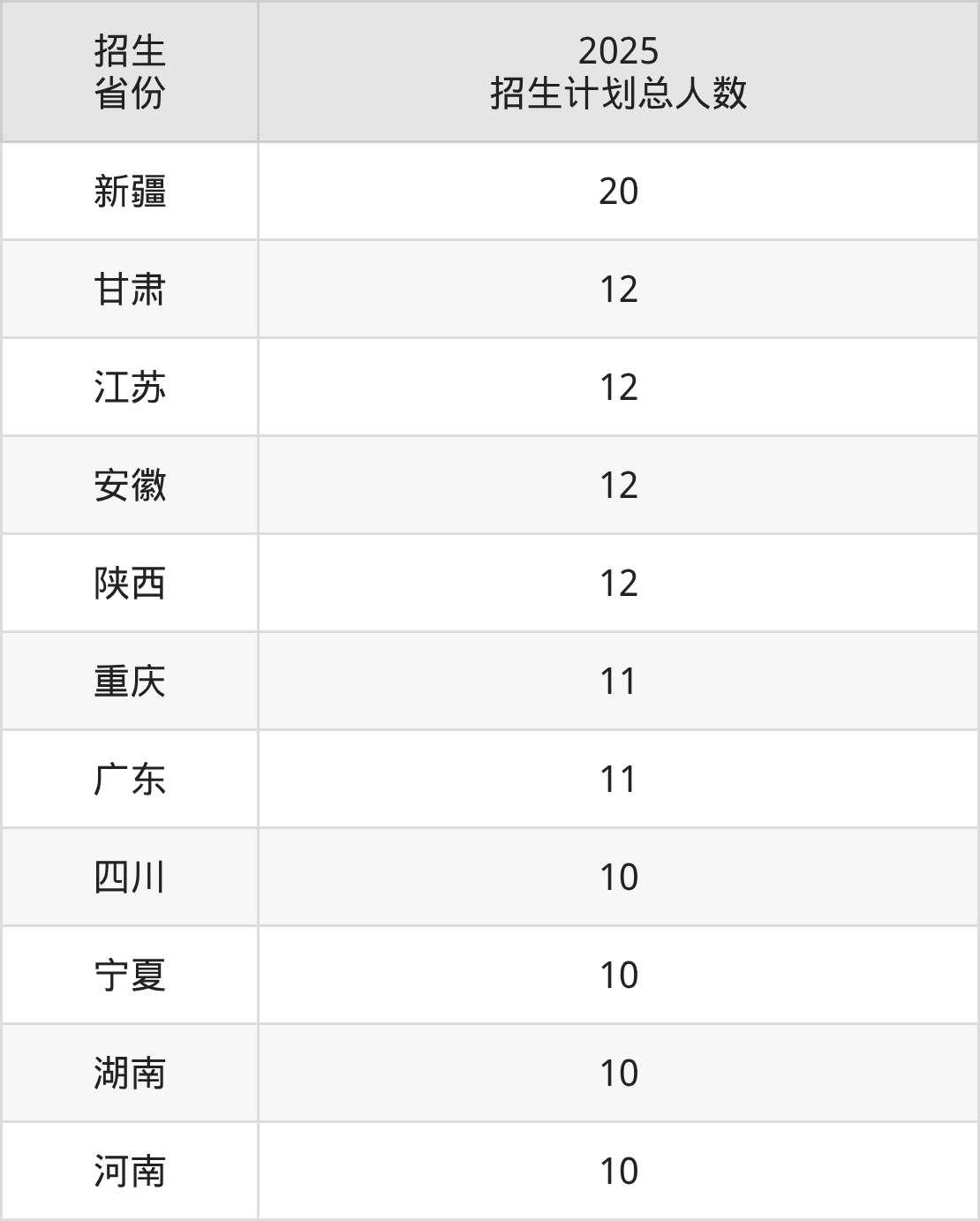 2025年新疆艺术学院面向全国11个省市开展本科招生;招生专业共4个,招生人数共130人。2025年在新疆维吾尔自治区招生计划总人数是20人,其中,新疆艺术学院在新疆维吾尔自治区招生人数最多的是文化产业管理。新疆艺术学院在各省具体招生人数情况如下表。