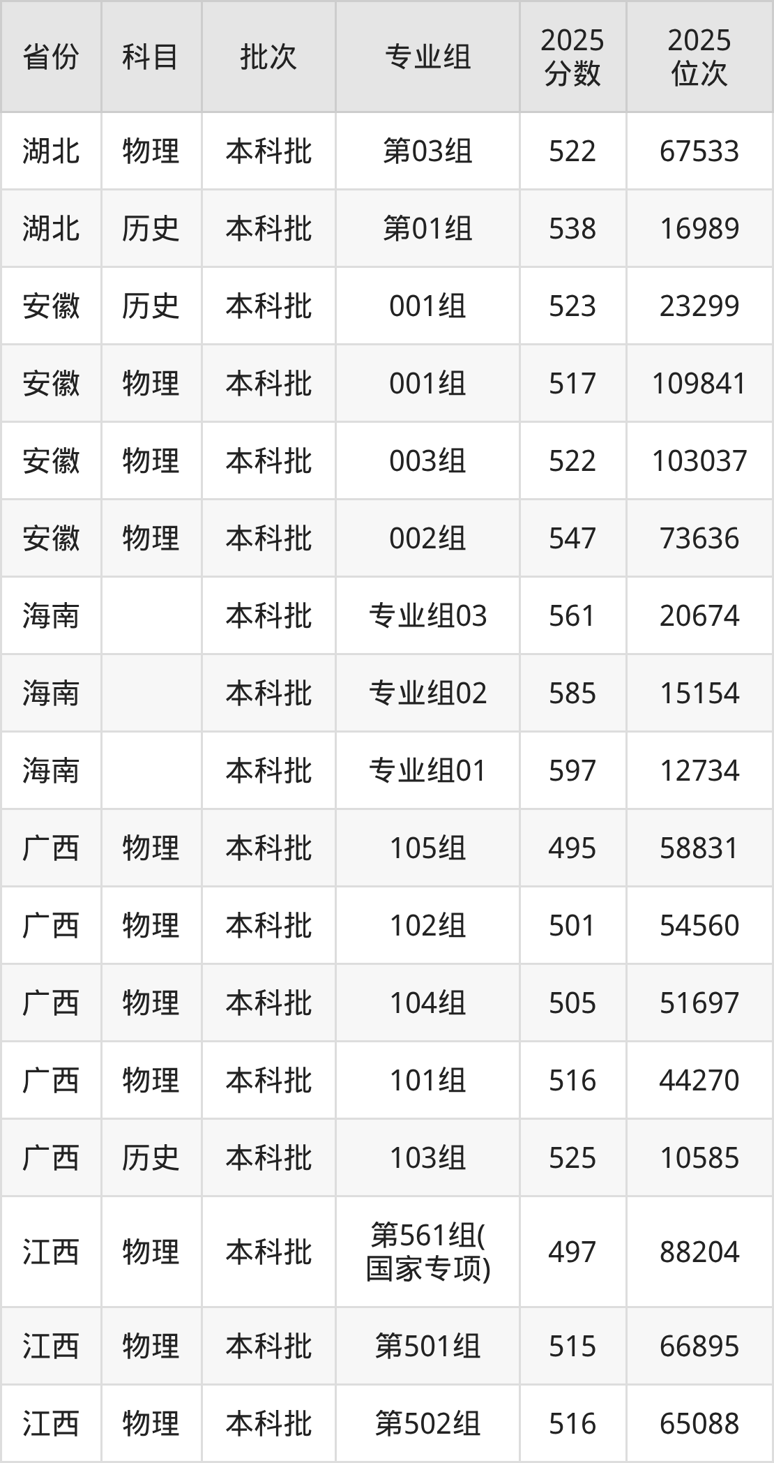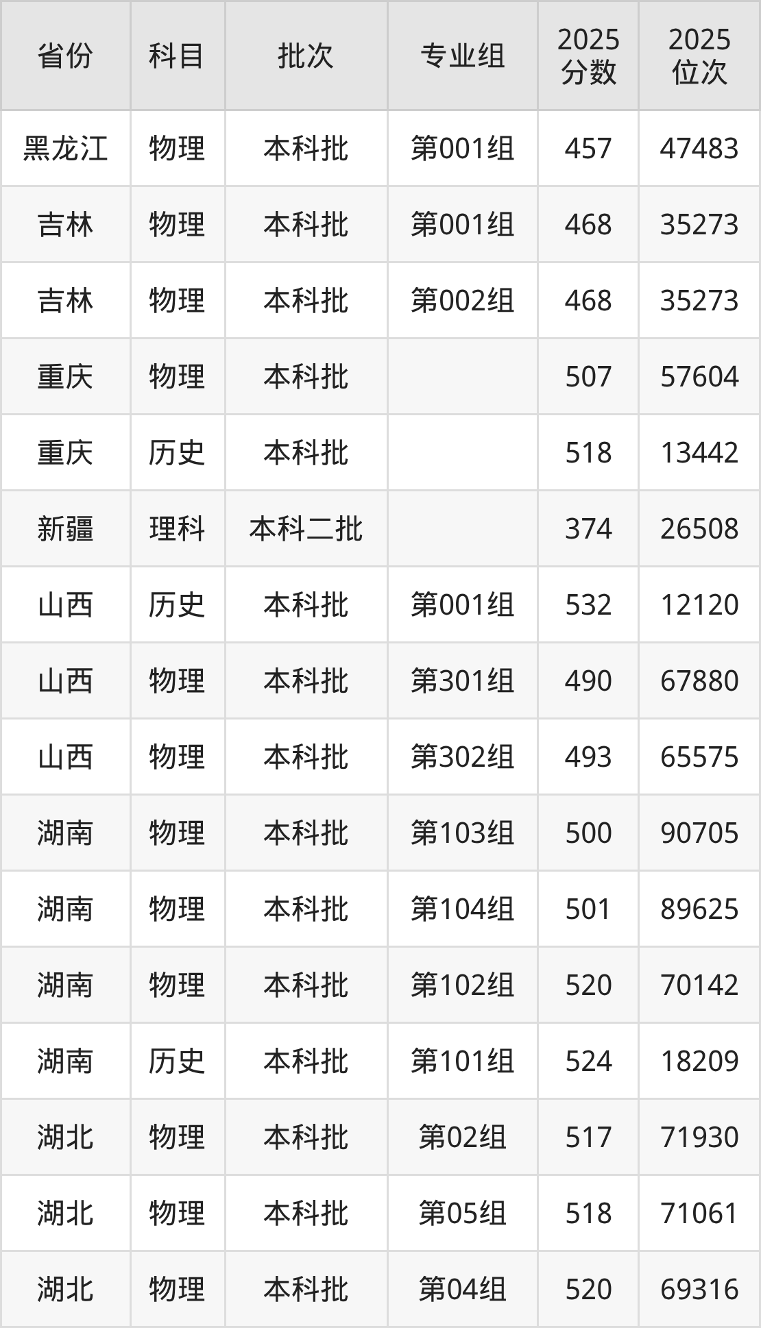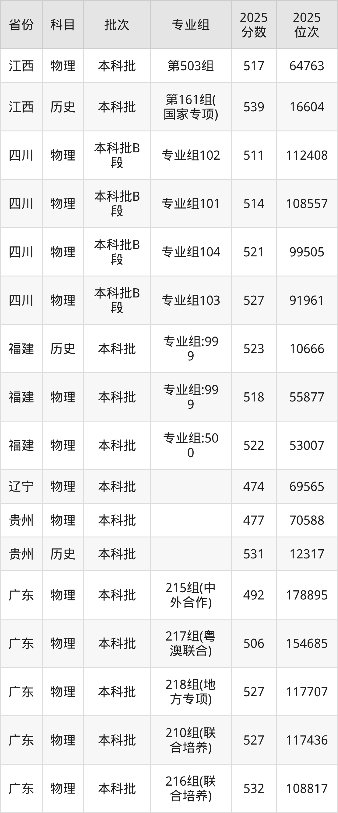 2025年在本科物理类进行招生,各专业组分数线详情如下: