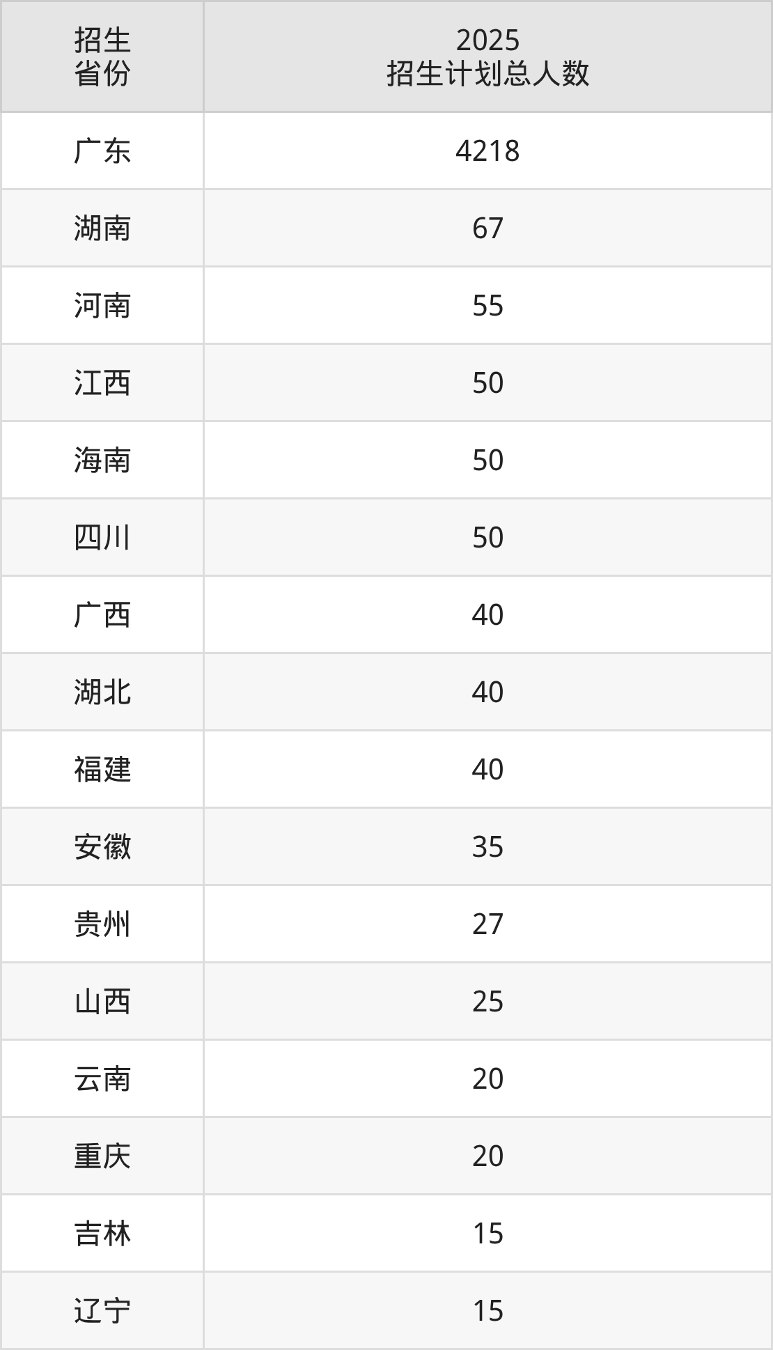 2025年佛山大学面向全国19个省市开展本科招生;招生专业共56个,招生人数共4789人。2025年在广东省招生计划总人数是4218人,其中,佛山大学在广东省招生人数最多的是机械设计制造及其自动化。佛山大学在各省具体招生人数情况如下表。