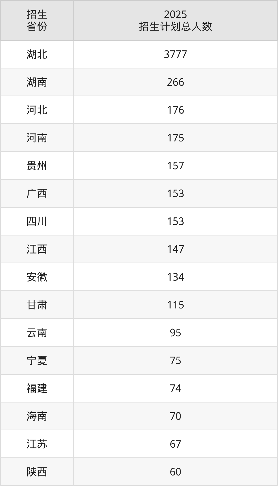 2025年三峡大学面向全国28个省市开展本科招生;招生专业共51个,招生人数共6012人。2025年在湖北省招生计划总人数是3777人,其中,三峡大学在湖北省招生人数最多的是临床医学。三峡大学在各省具体招生人数情况如下表。
