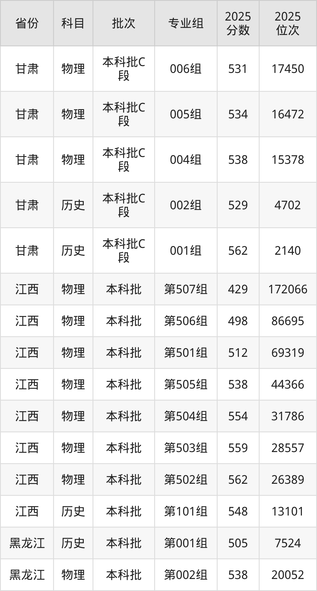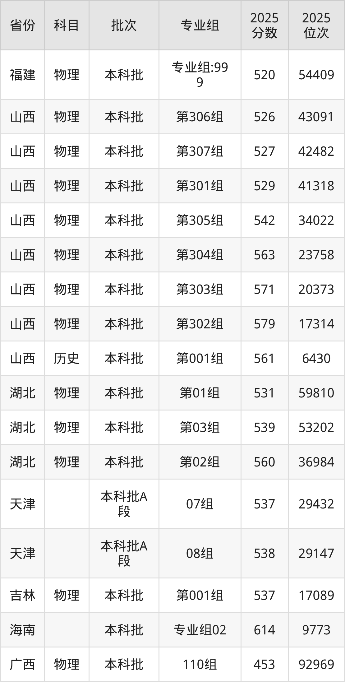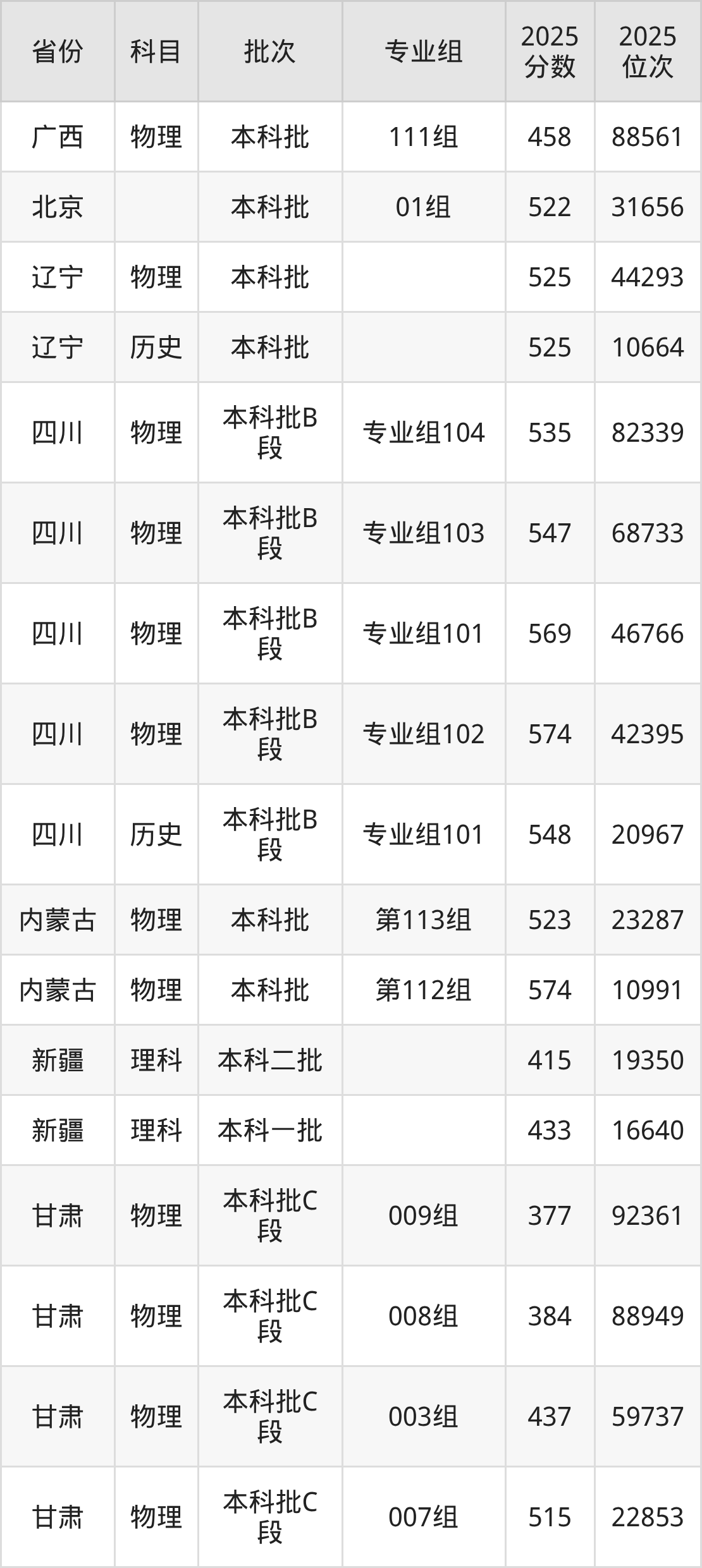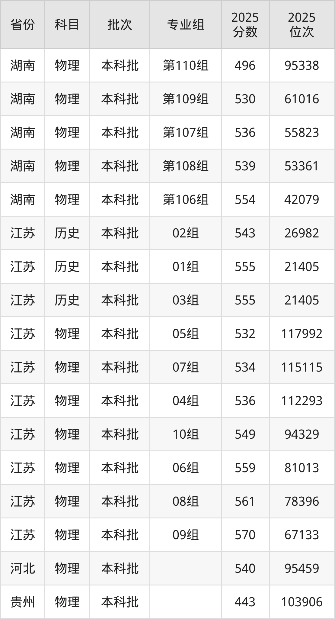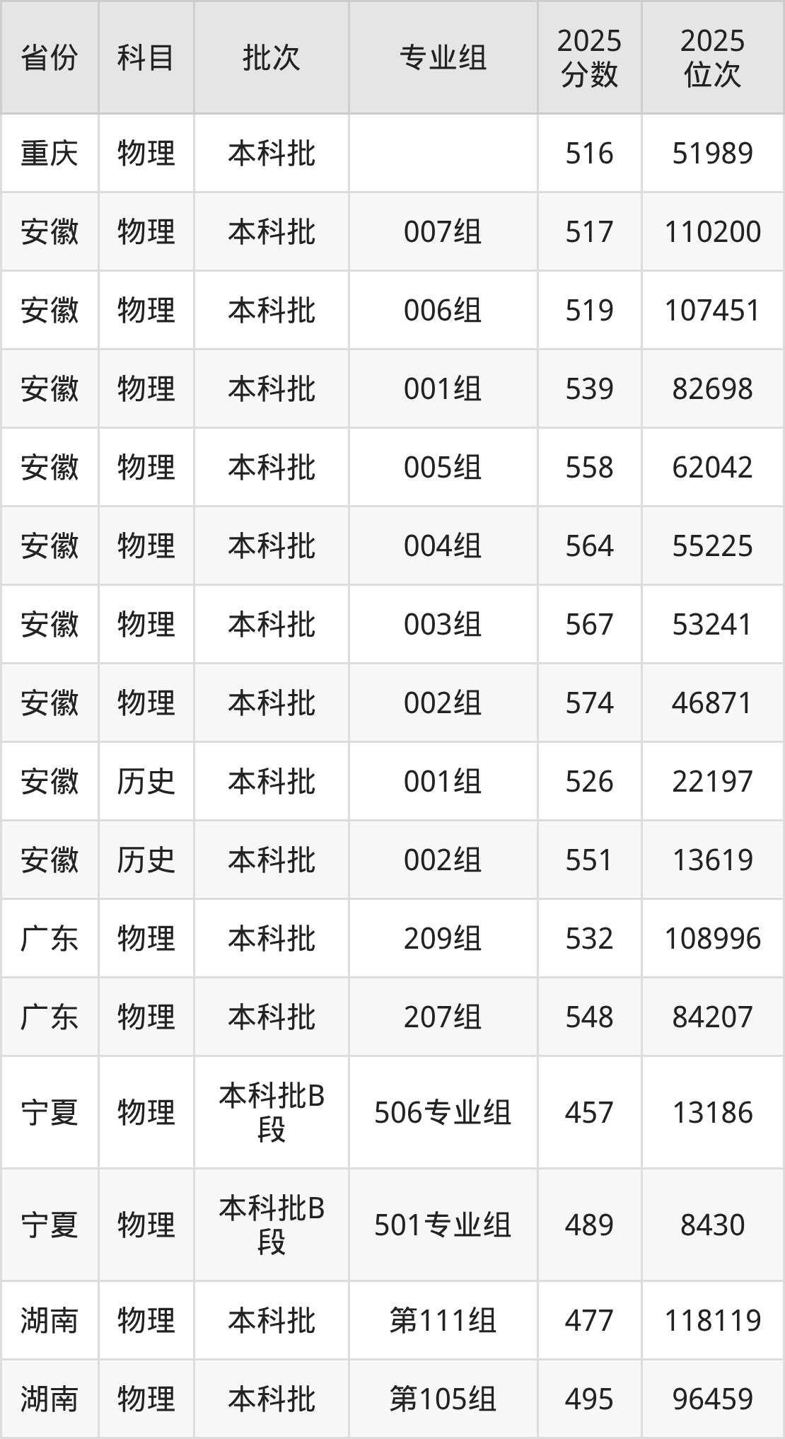 2025年在本科物理类进行招生,各专业组分数线详情如下:
