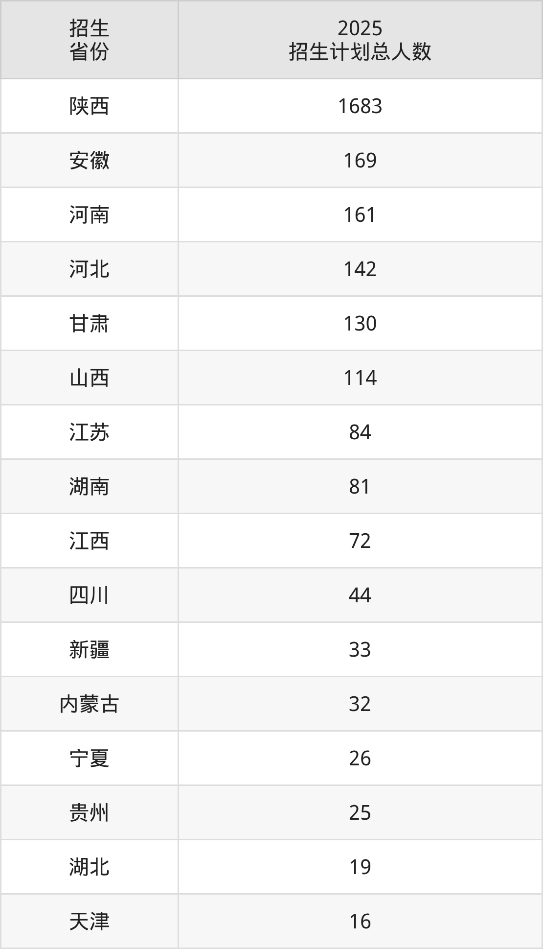 2025年西安工程大学面向全国27个省市开展本科招生;招生专业共35个,招生人数共2917人。2025年在陕西省招生计划总人数是1683人,其中,西安工程大学在陕西省招生人数最多的是计算机类。西安工程大学在各省具体招生人数情况如下表。