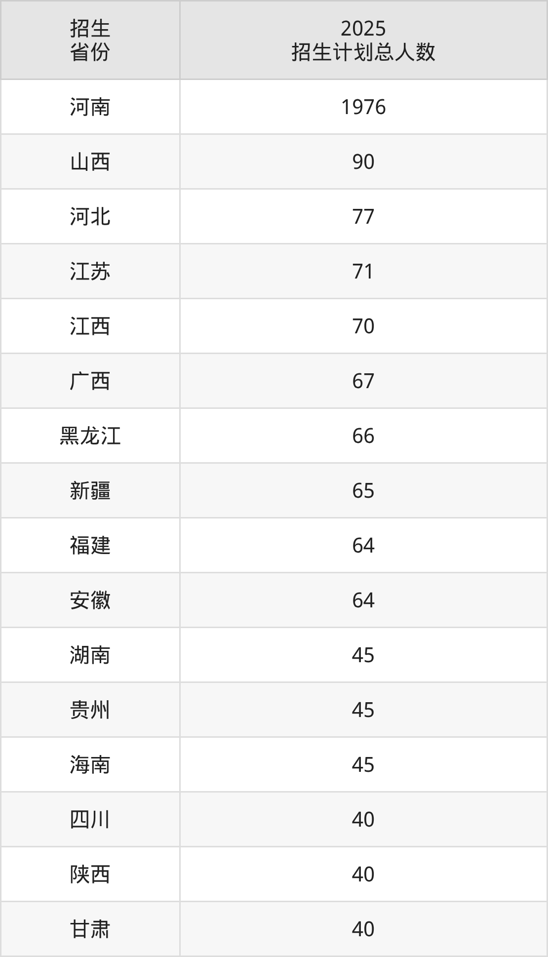 2025年中原工学院面向全国26个省市开展本科招生;招生专业共59个,招生人数共3063人。2025年在河南省招生计划总人数是1976人,其中,中原工学院在河南省招生人数最多的是电子信息工程。中原工学院在各省具体招生人数情况如下表。