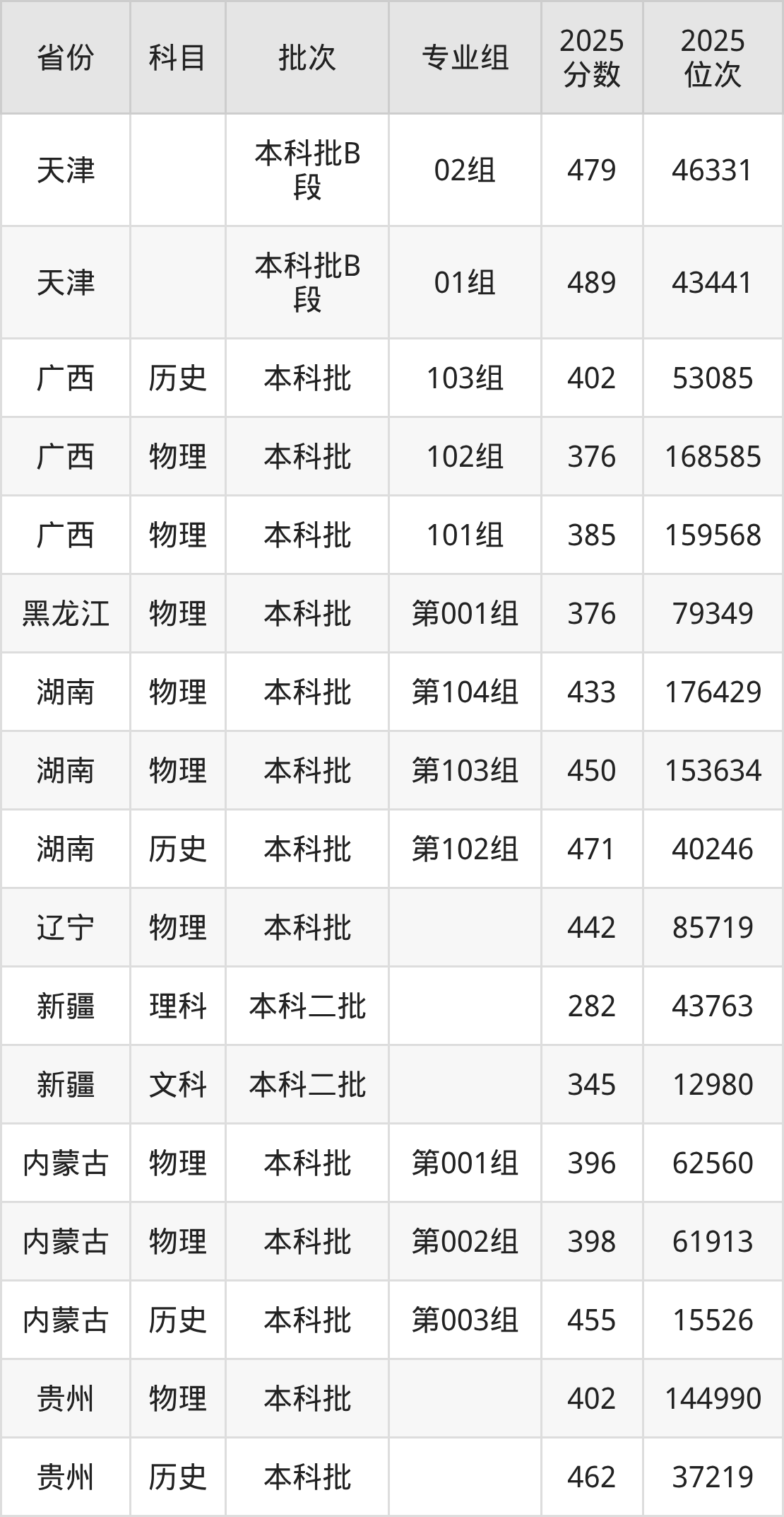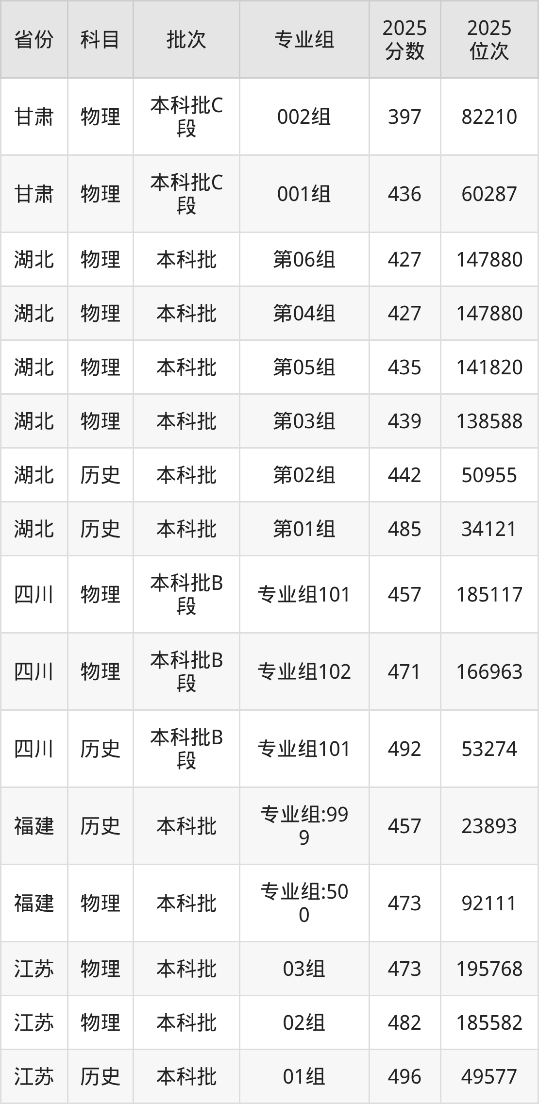 2025年在本科物理类进行招生,各专业组分数线详情如下: