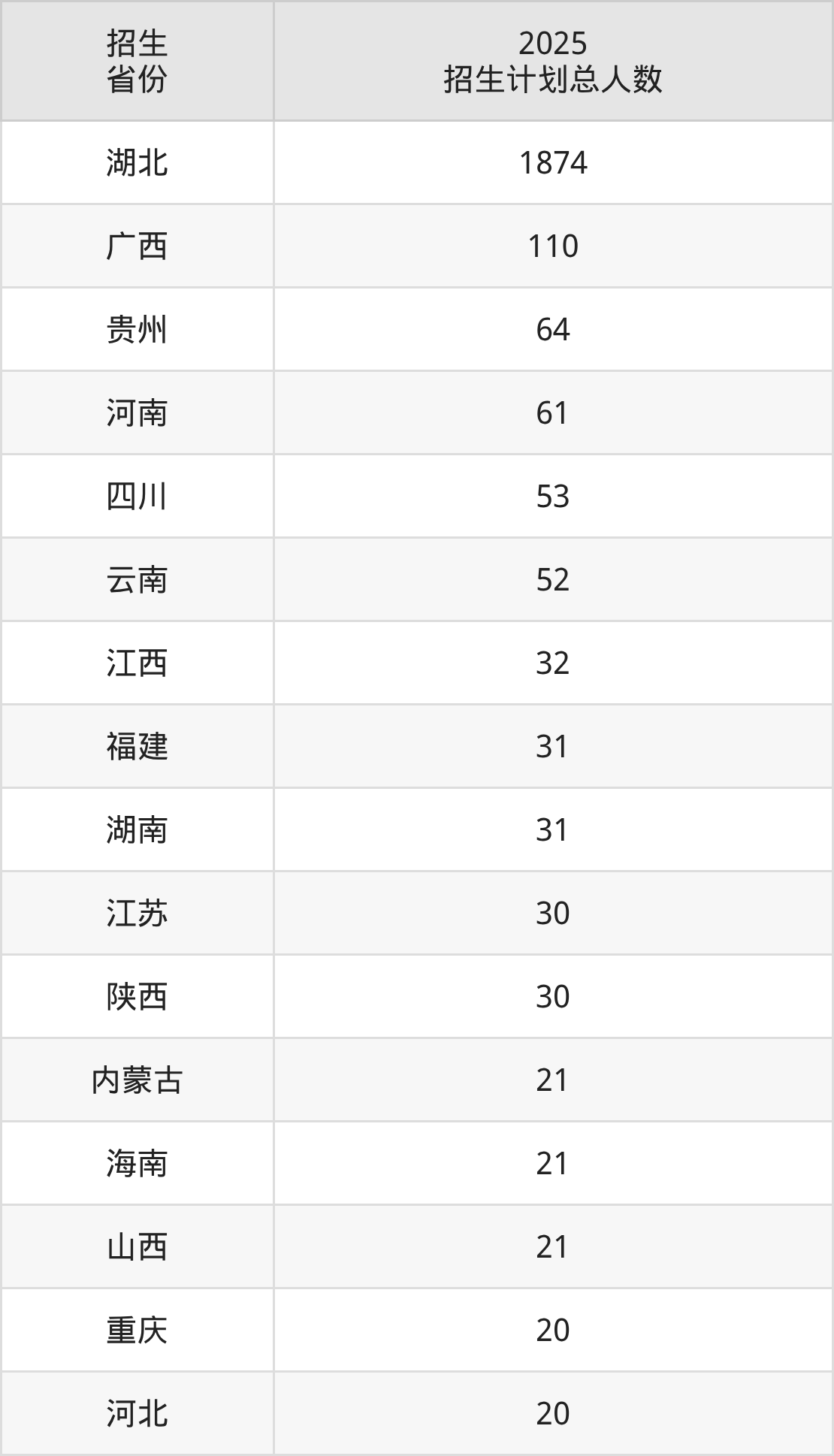 2025年武汉工程大学邮电与信息工程学院面向全国24个省市开展本科招生;招生专业共27个,招生人数共2061人。2025年在湖北省招生计划总人数是1874人,其中,武汉工程大学邮电与信息工程学院在湖北省招生人数最多的是电气工程及其自动化。武汉工程大学邮电与信息工程学院在各省具体招生人数情况如下表。