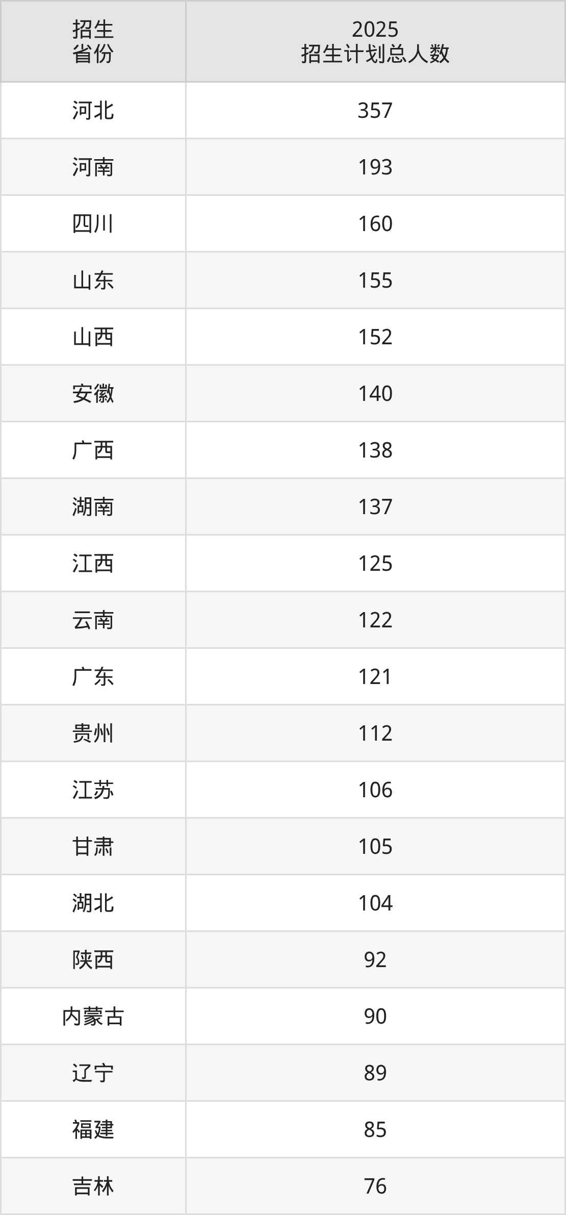 2025年华北电力大学(保定)面向全国29个省市开展本科招生;招生专业共38个,招生人数共3070人。2025年在河北省招生计划总人数是357人,其中,华北电力大学(保定)在河北省招生人数最多的是电气工程及其自动化。华北电力大学(保定)在各省具体招生人数情况如下表。