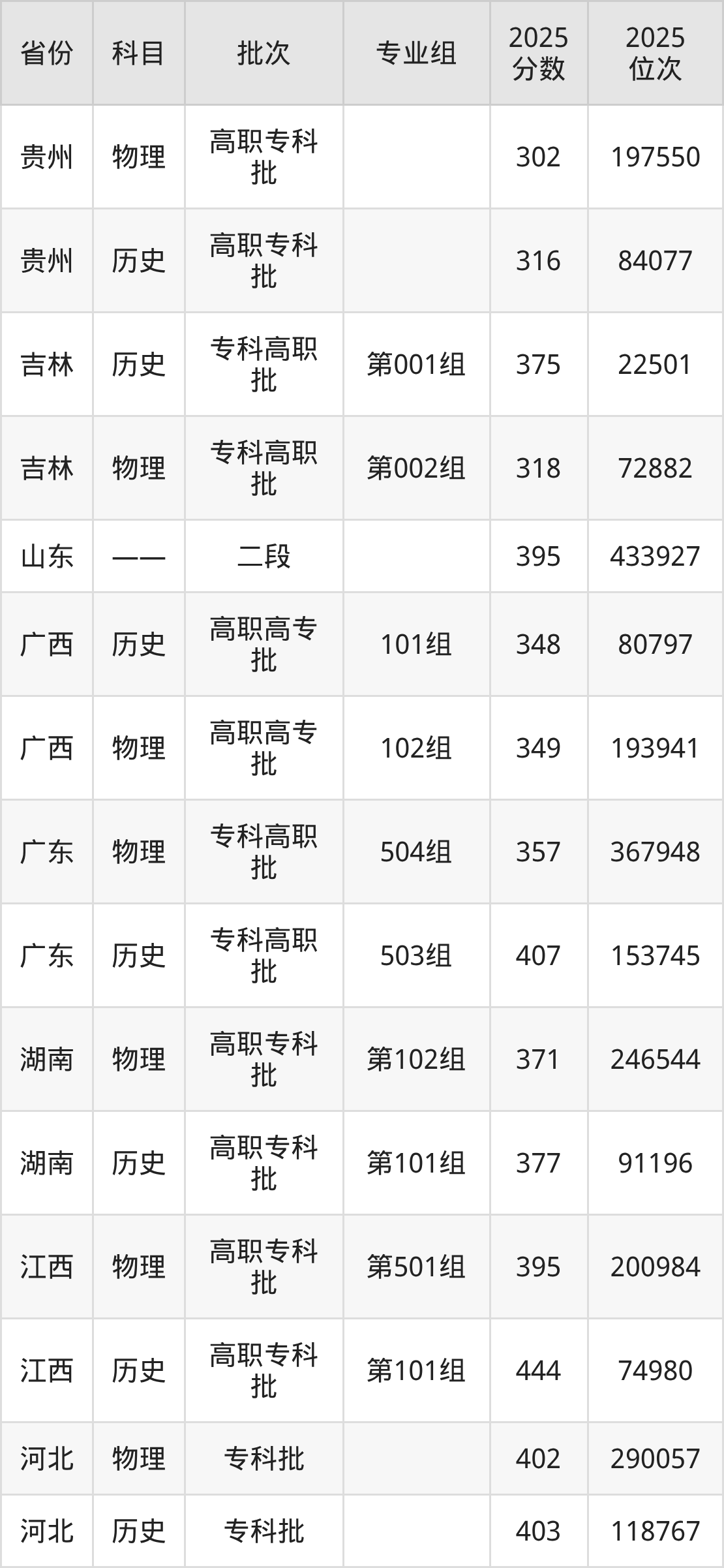 2025年湖南现代物流职业技术学院全国录取分数线是302分到444分,录取最低在贵州物理类、录取最高在江西历史类(第101组)。各省各专业组最低分具有差异,详情如下: