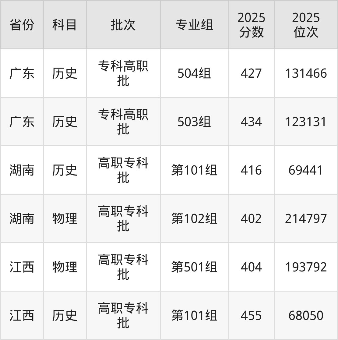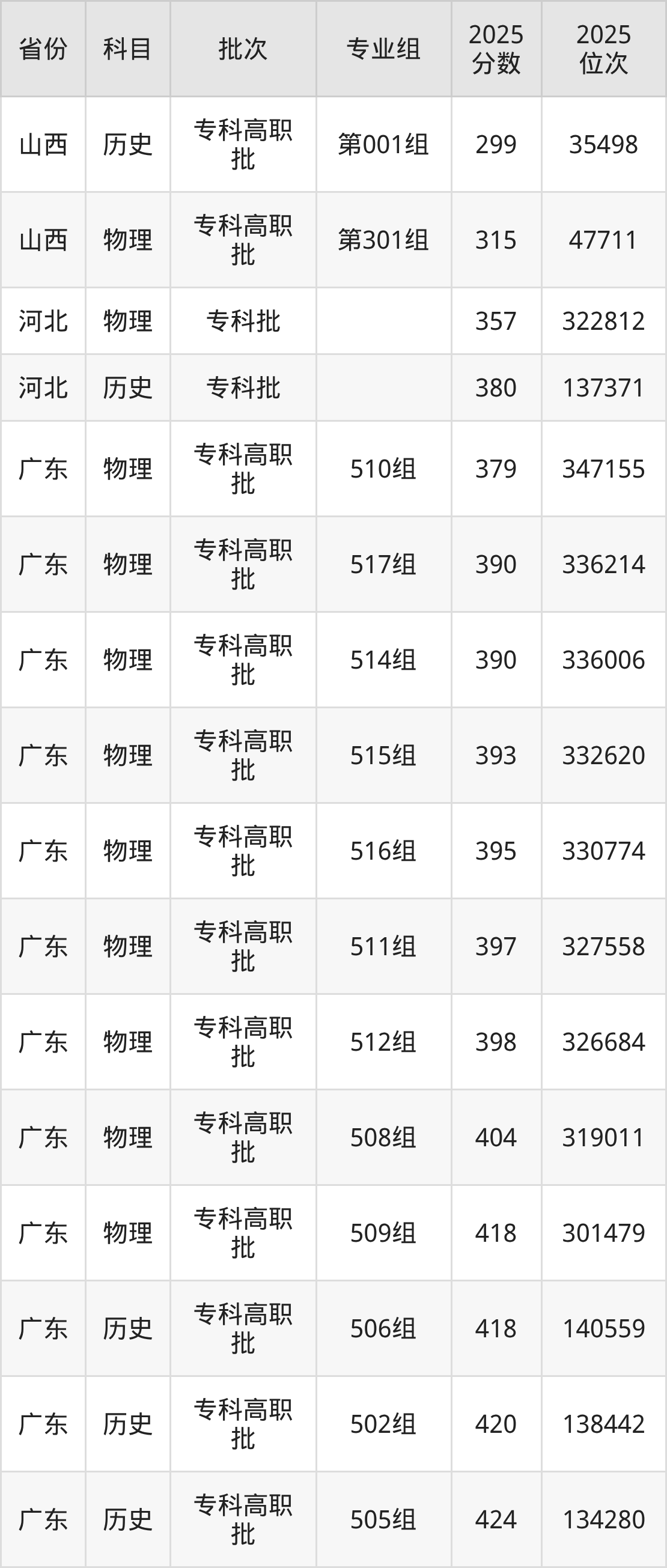 2025年惠州工程职业学院全国录取分数线是299分到455分,录取最低在山西历史类(第001组)、录取最高在江西历史类(第101组)。各省各专业组最低分具有差异,详情如下: