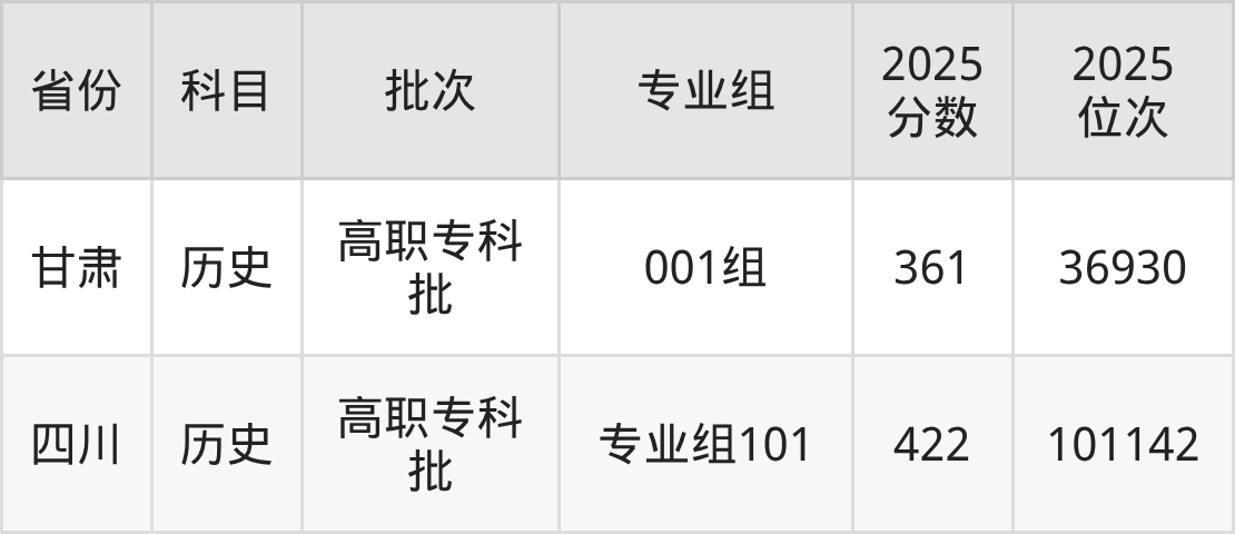 2025年在专科历史类进行招生,各专业组分数线详情如下:
