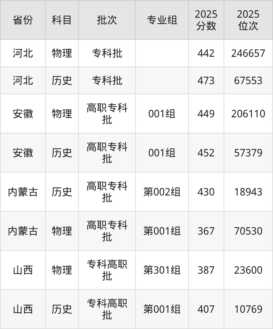 普通类专科物理类最低449分,专科历史类最低452分