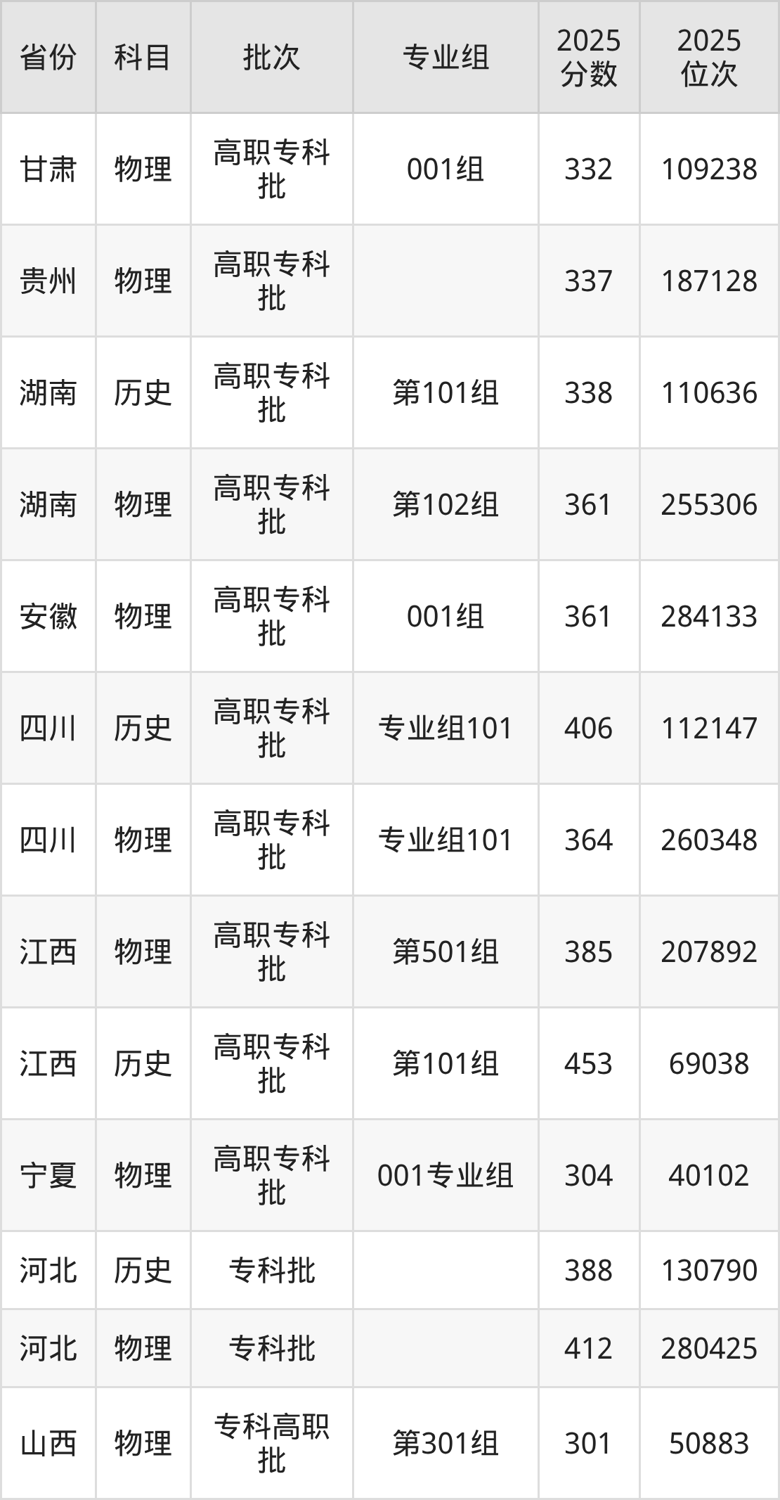 2025年在专科物理类进行招生,各专业组分数线详情如下: