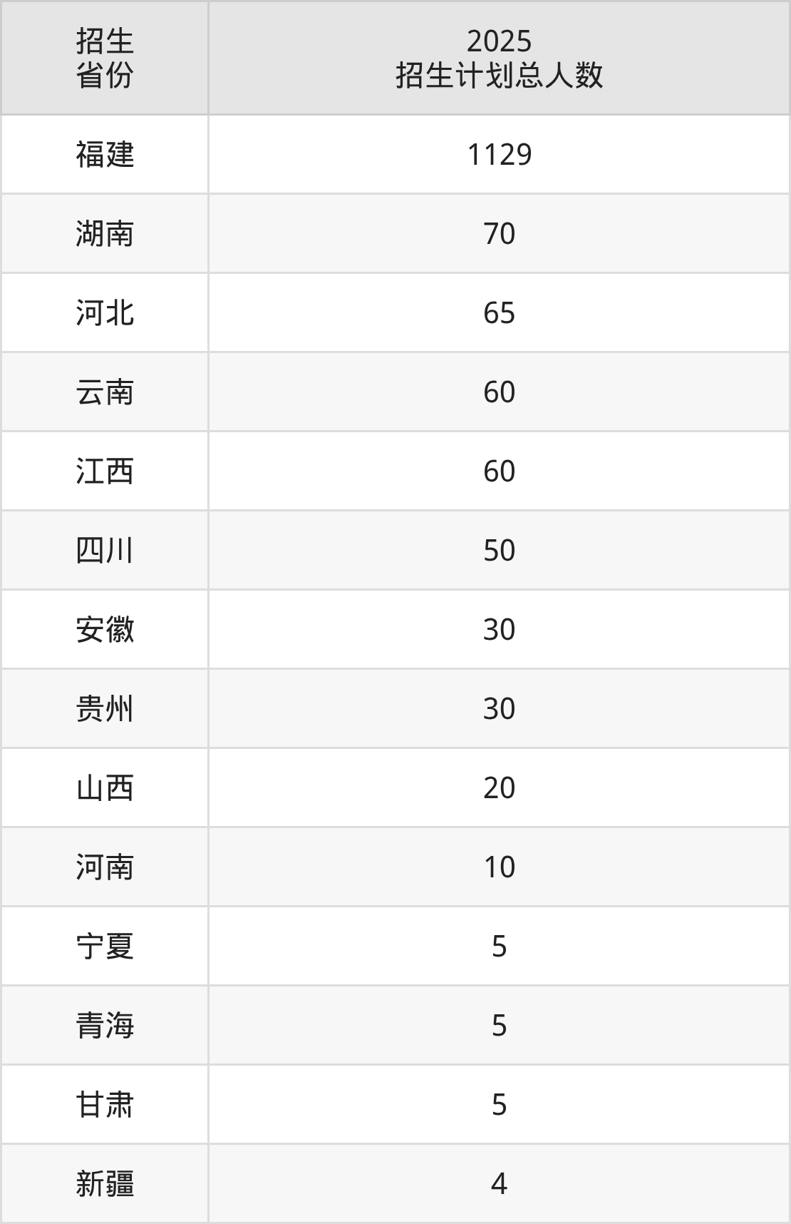 2025年湄洲湾职业技术学院面向全国14个省市开展专科招生;招生专业共42个,招生人数共1543人。2025年在福建省招生计划总人数是1129人,其中,湄洲湾职业技术学院在福建省招生人数最多的是人工智能技术应用。湄洲湾职业技术学院在各省具体招生人数情况如下表。