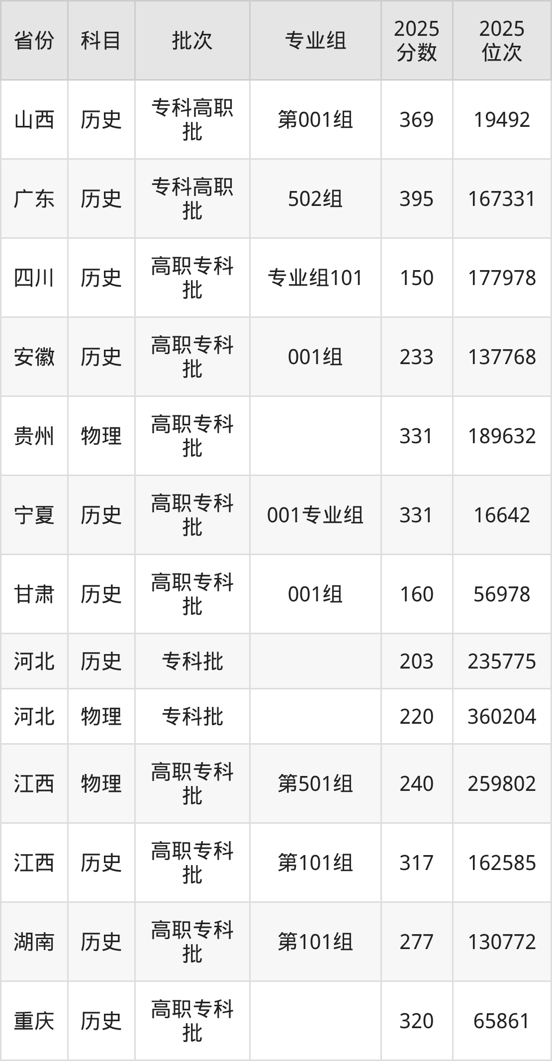 下面是2025年江西洪州职业学院全国录取分数线一览表,请查阅。