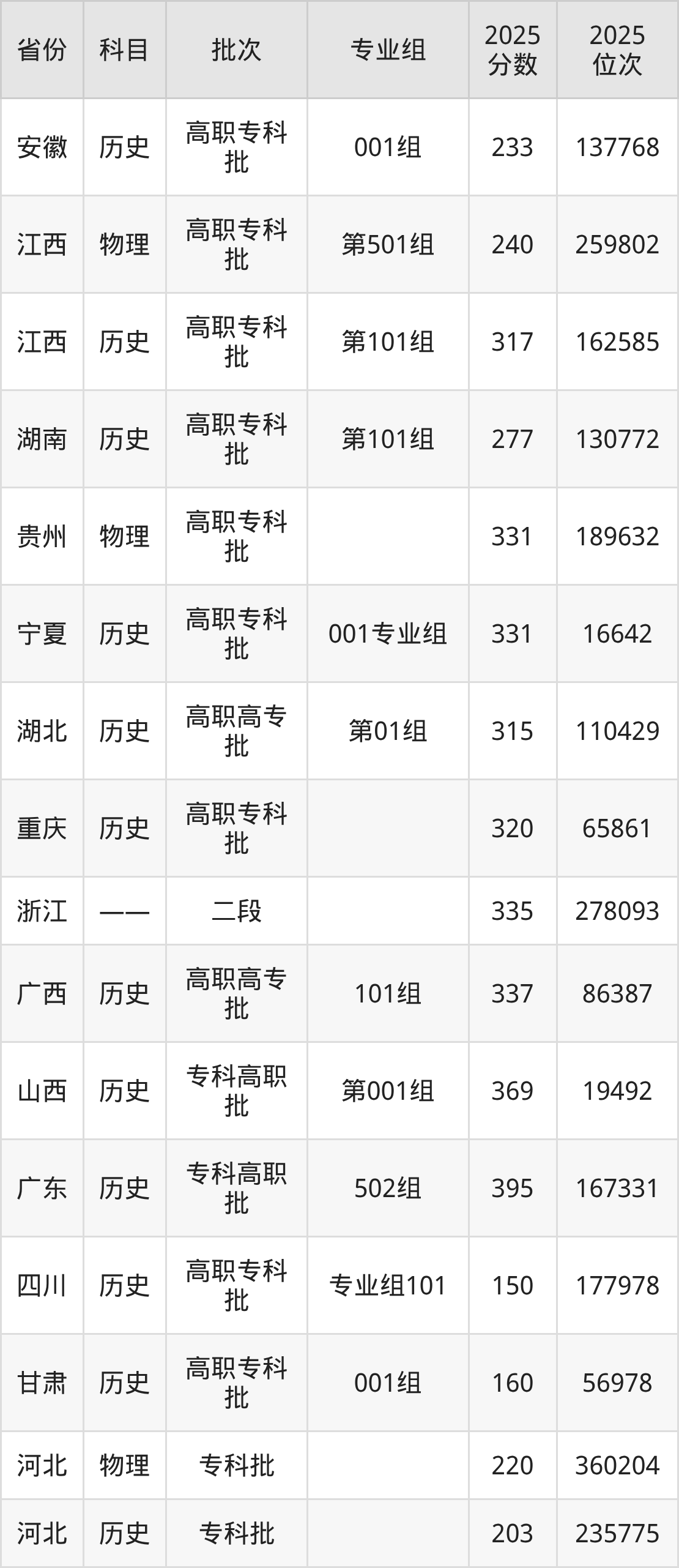 2025年江西洪州职业学院全国录取分数线是150分到395分,录取最低在四川历史类(专业组101)、录取最高在广东历史类(502组)。各省各专业组最低分具有差异,详情如下: