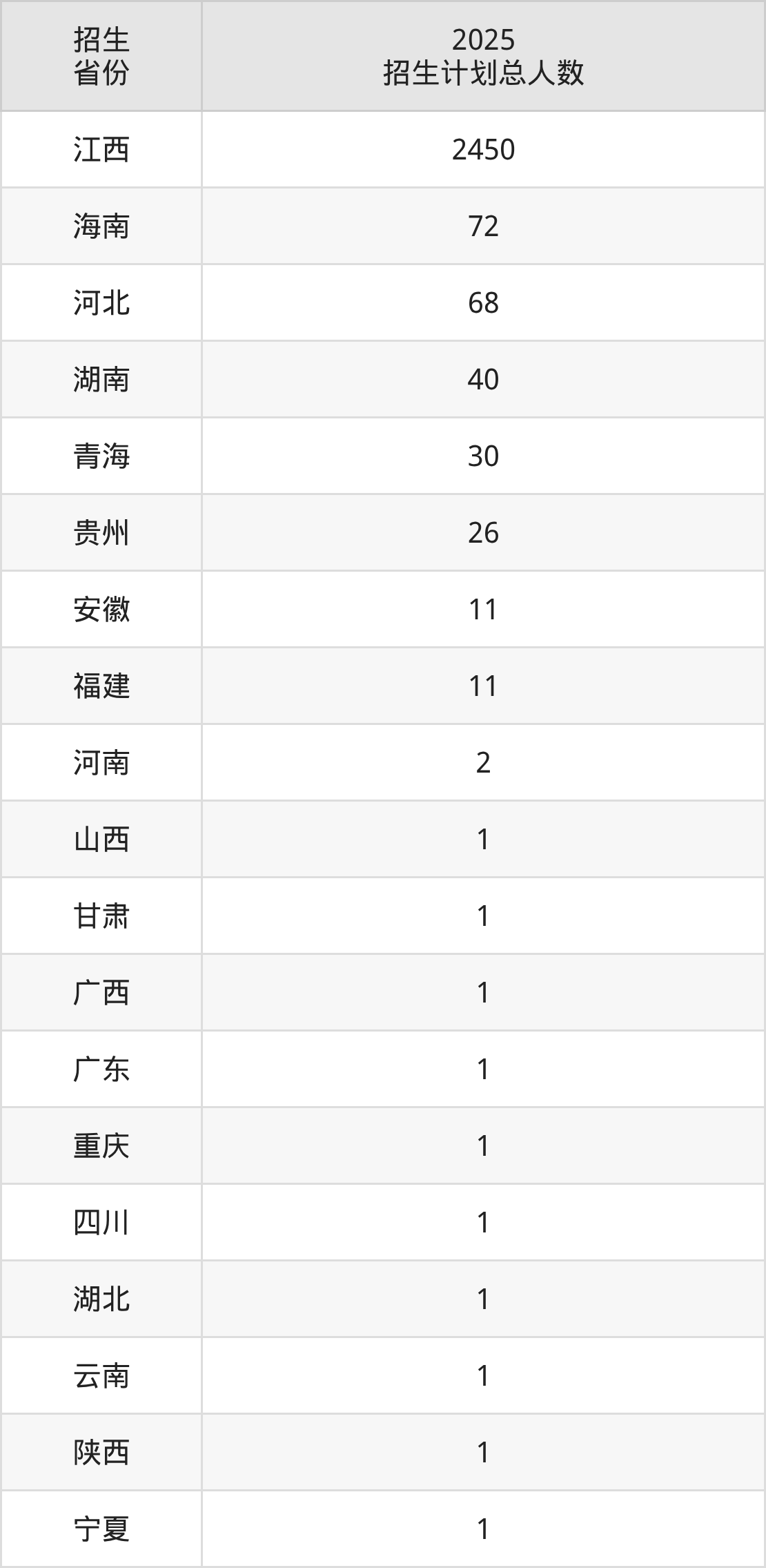 2025年江西洪州职业学院面向全国19个省市开展专科招生;招生专业共32个,招生人数共2720人。2025年在江西省招生计划总人数是2450人,其中,江西洪州职业学院在江西省招生人数最多的是集成电路技术。江西洪州职业学院在各省具体招生人数情况如下表。