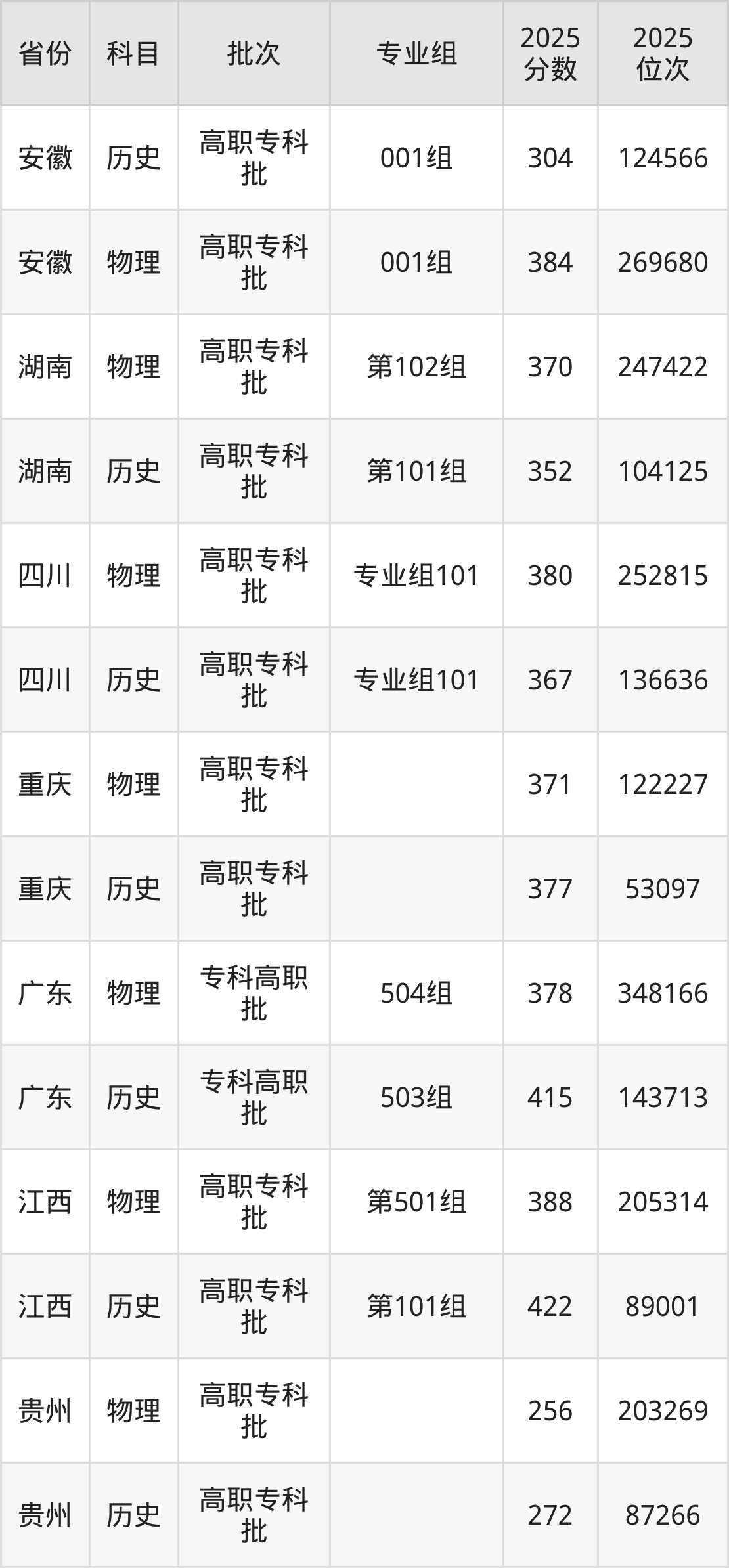2025年广西工业职业技术学院全国录取分数线是256分到422分,录取最低在贵州物理类、录取最高在江西历史类(第101组)。各省各专业组最低分具有差异,详情如下: