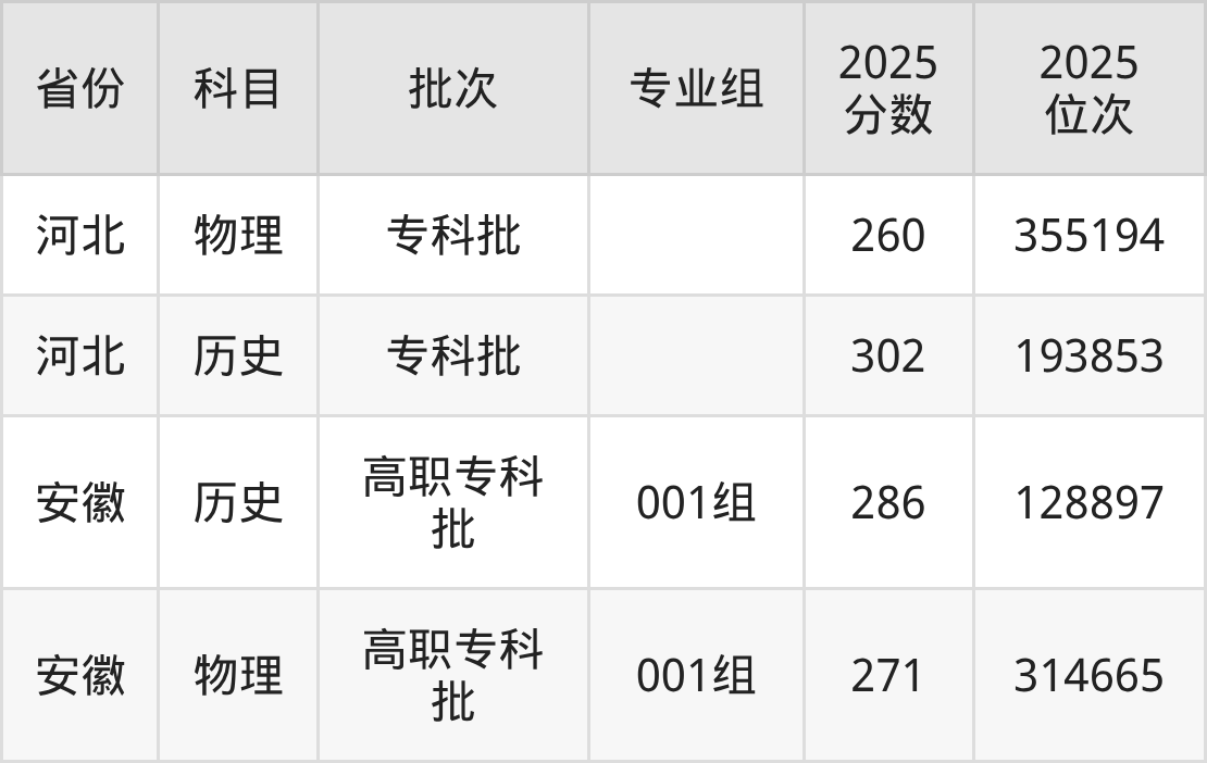 下面是2025年民办合肥滨湖职业技术学院全国录取分数线一览表,请查阅。