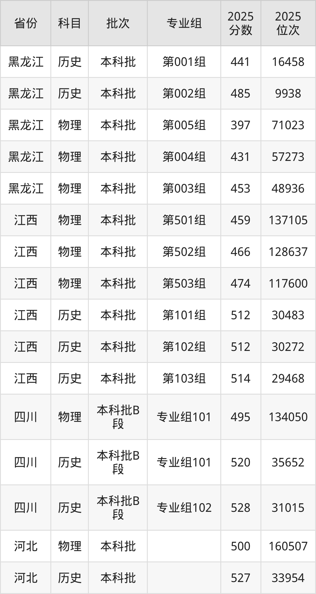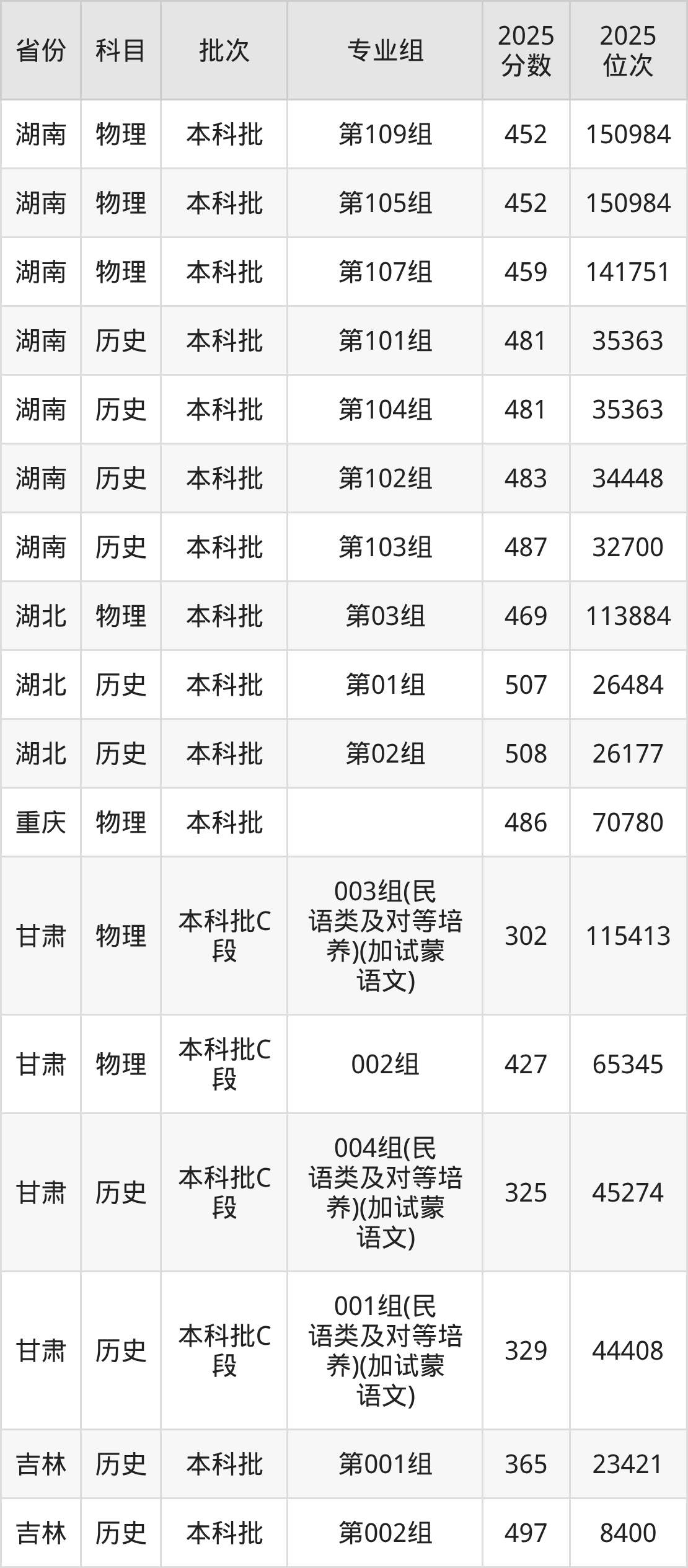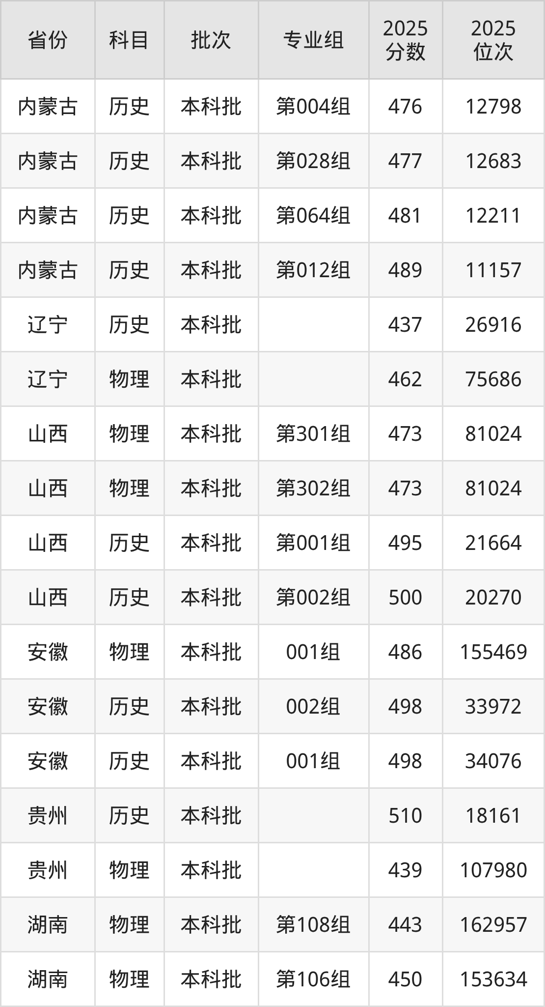 2025年在本科物理类进行招生,各专业组分数线详情如下: