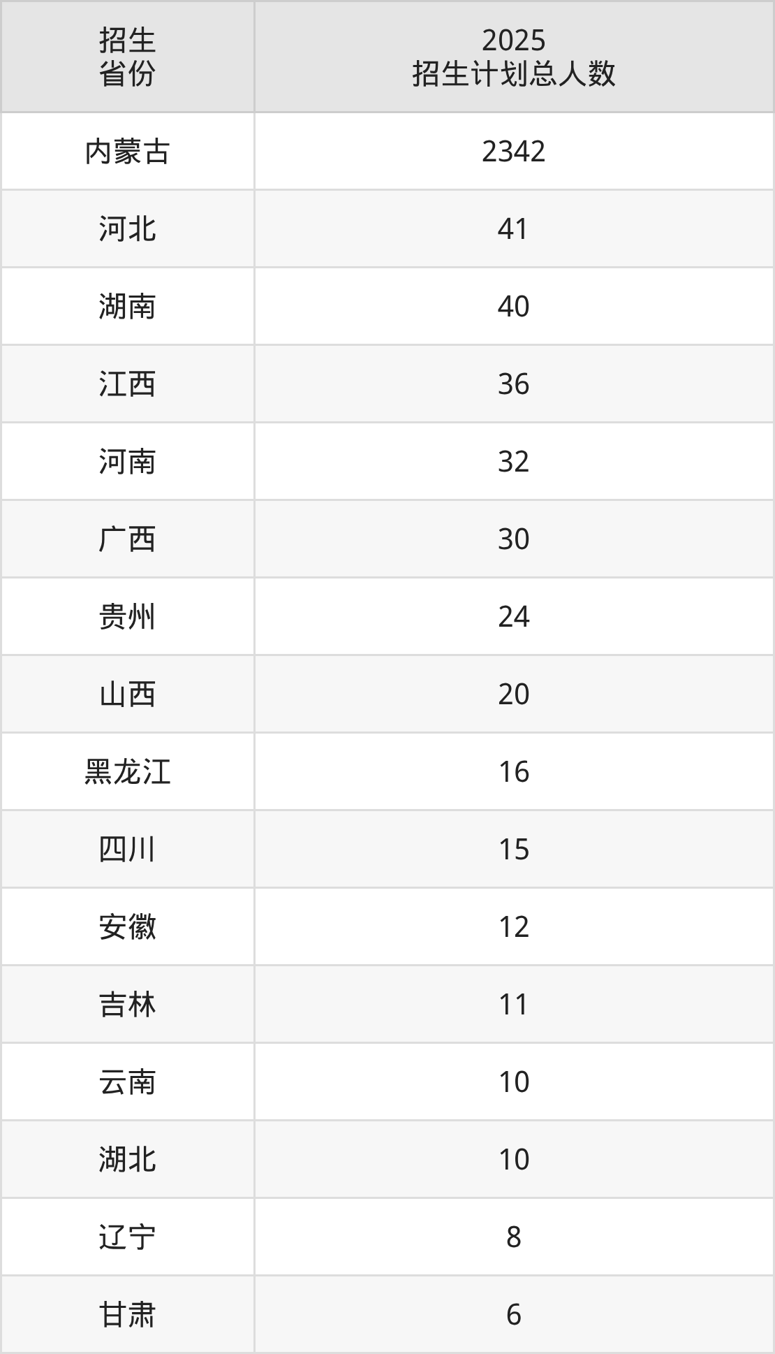 2025年呼伦贝尔学院面向全国19个省市开展本科招生;招生专业共41个,招生人数共2662人。2025年在内蒙古自治区招生计划总人数是2342人,其中,呼伦贝尔学院在内蒙古自治区招生人数最多的是软件工程。呼伦贝尔学院在各省具体招生人数情况如下表。