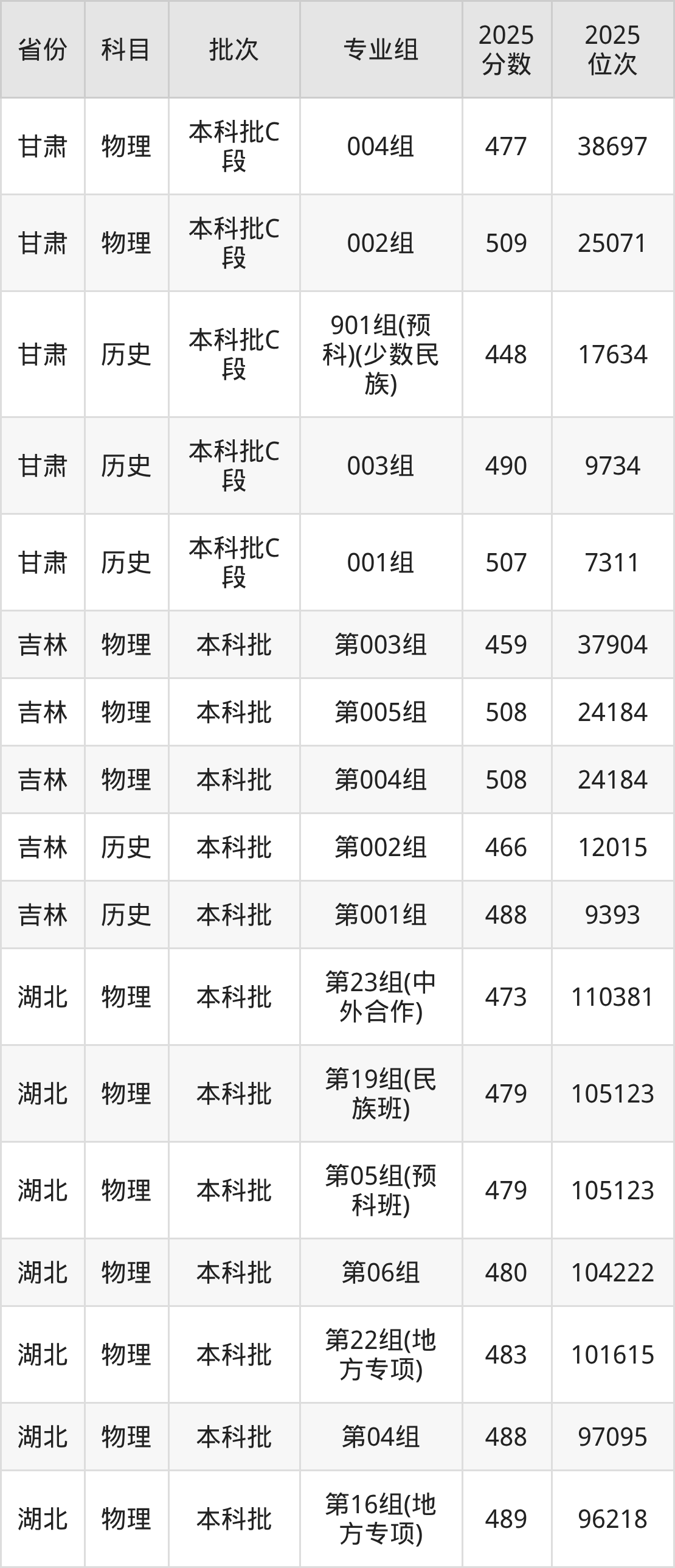 湖北民族大学第003组:2025年投档录取最低分为459分,录取最低位次为37904名。