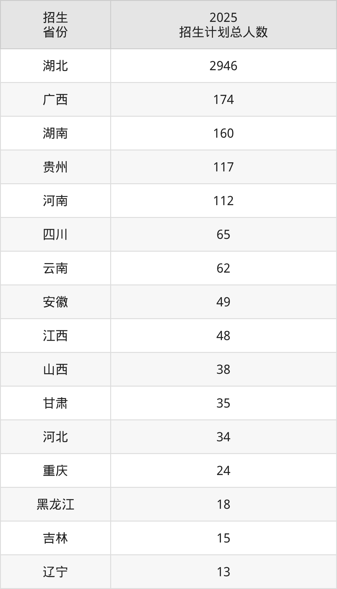 2025年湖北民族大学面向全国22个省市开展本科招生;招生专业共45个,招生人数共3966人。2025年在湖北省招生计划总人数是2946人,其中,湖北民族大学在湖北省招生人数最多的是临床医学。湖北民族大学在各省具体招生人数情况如下表。