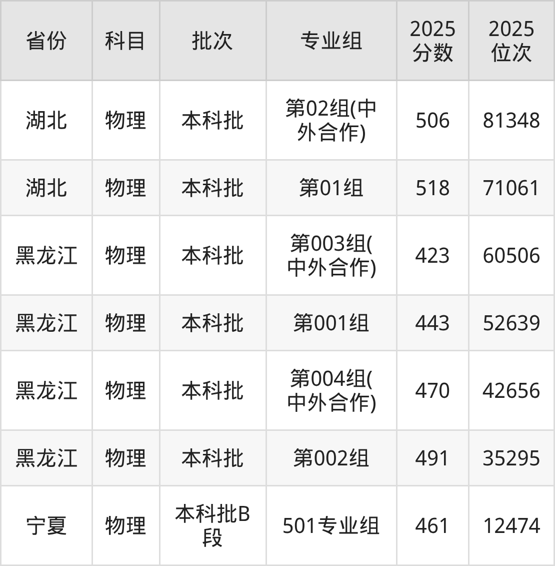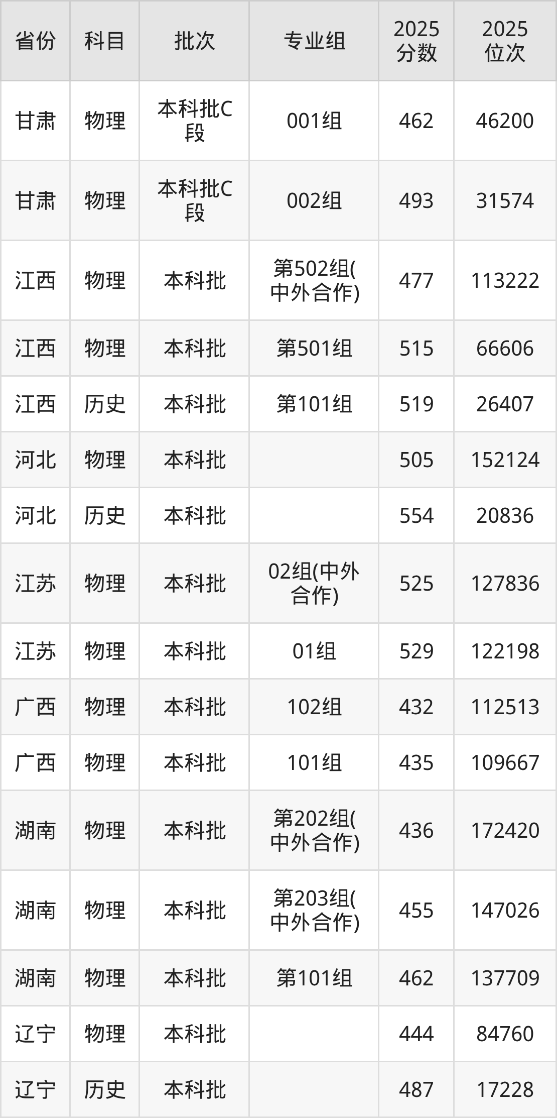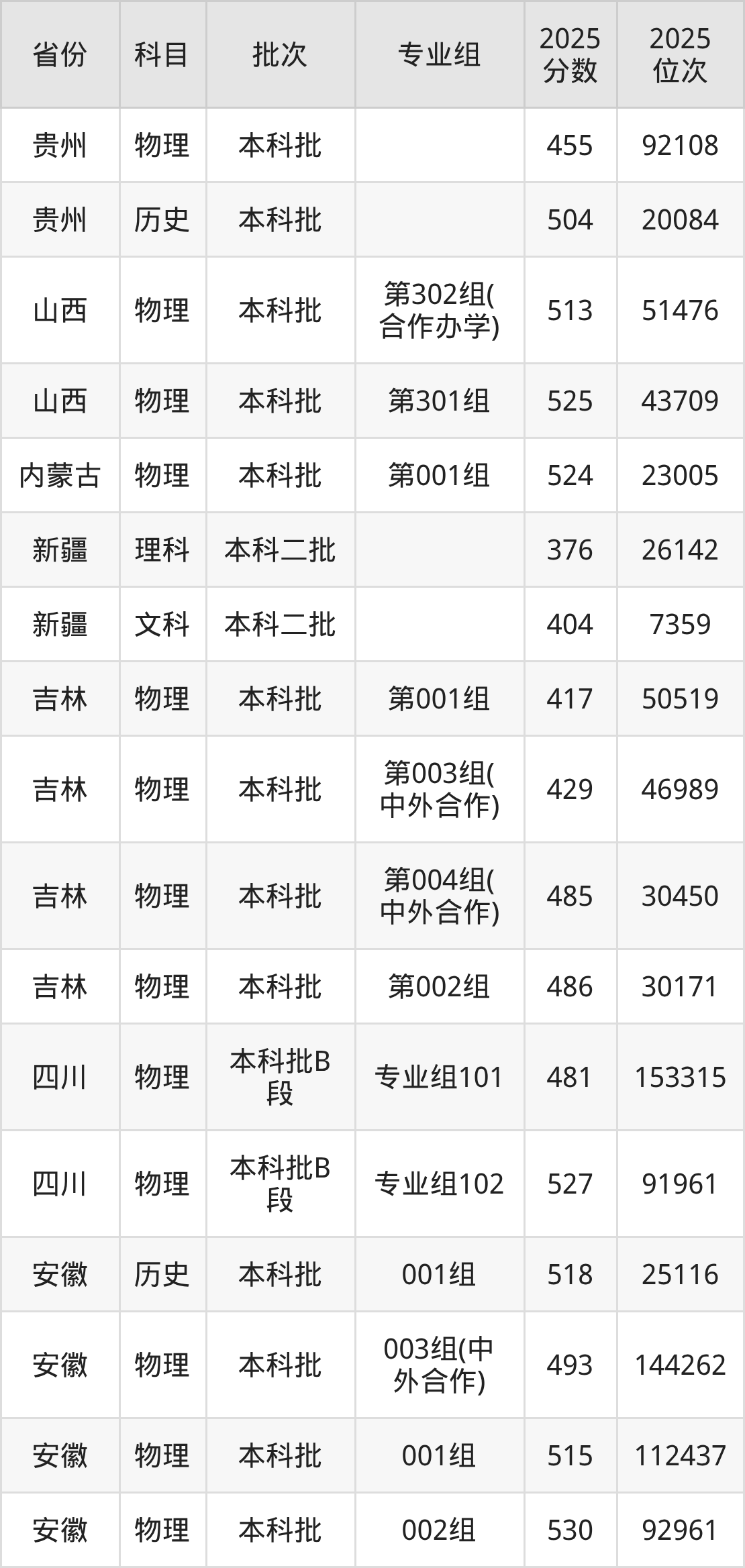 2025年在本科物理类进行招生,各专业组分数线详情如下: