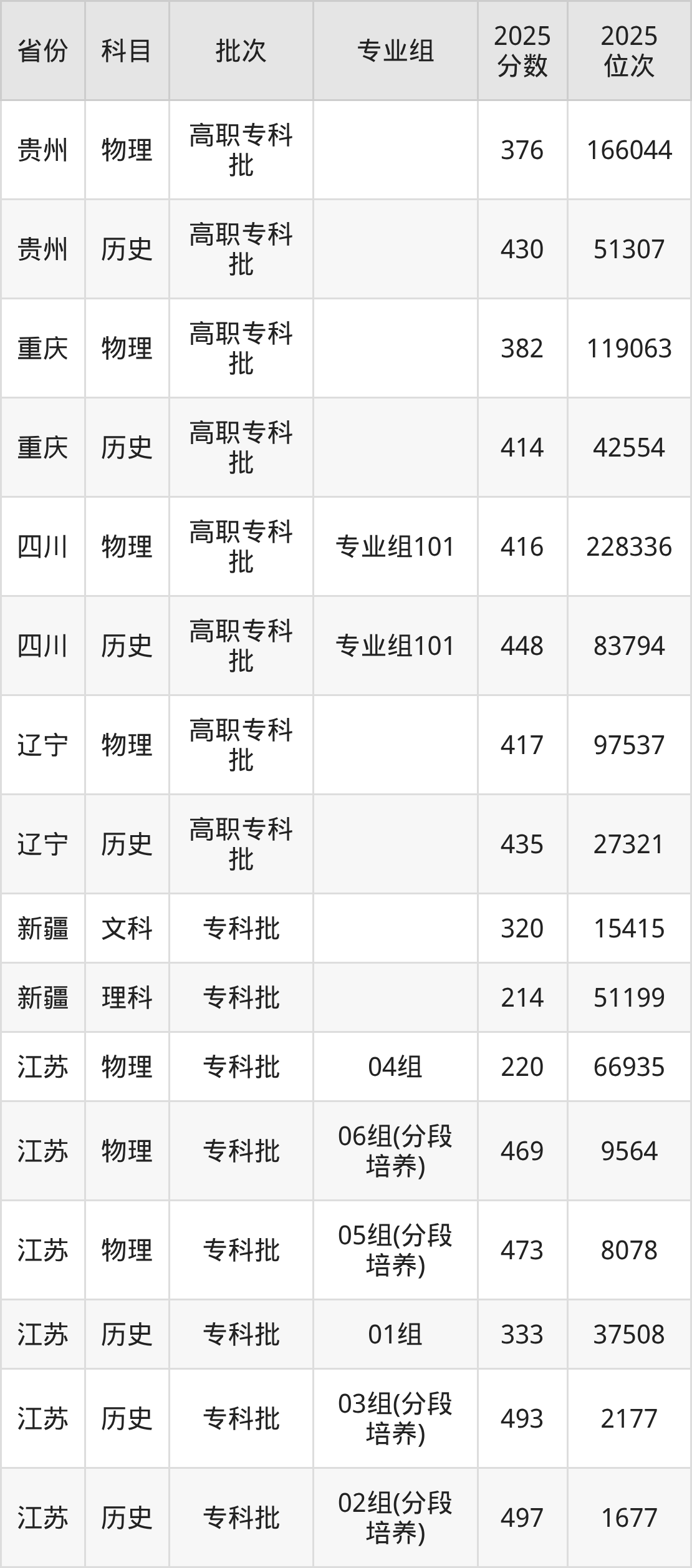 普通类专科物理类最低376分,专科历史类最低430分