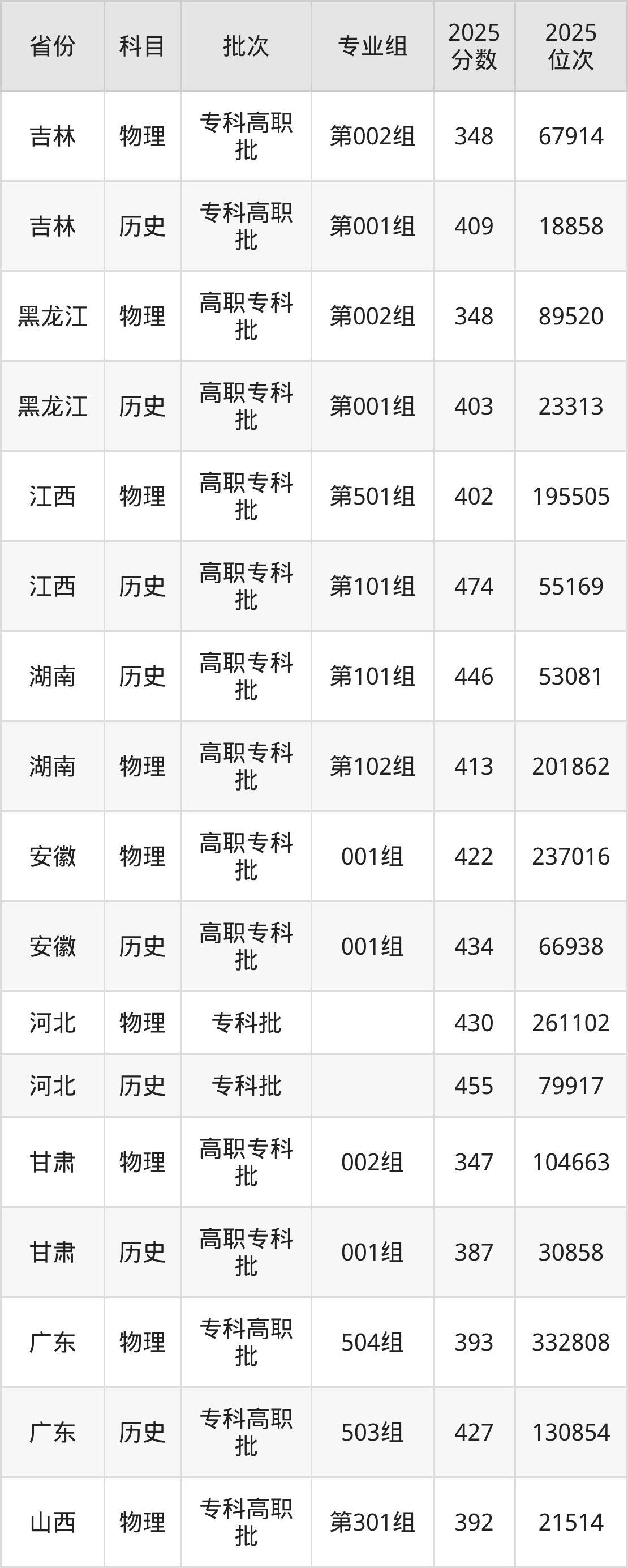 普通类专科物理类最低348分,专科历史类最低403分