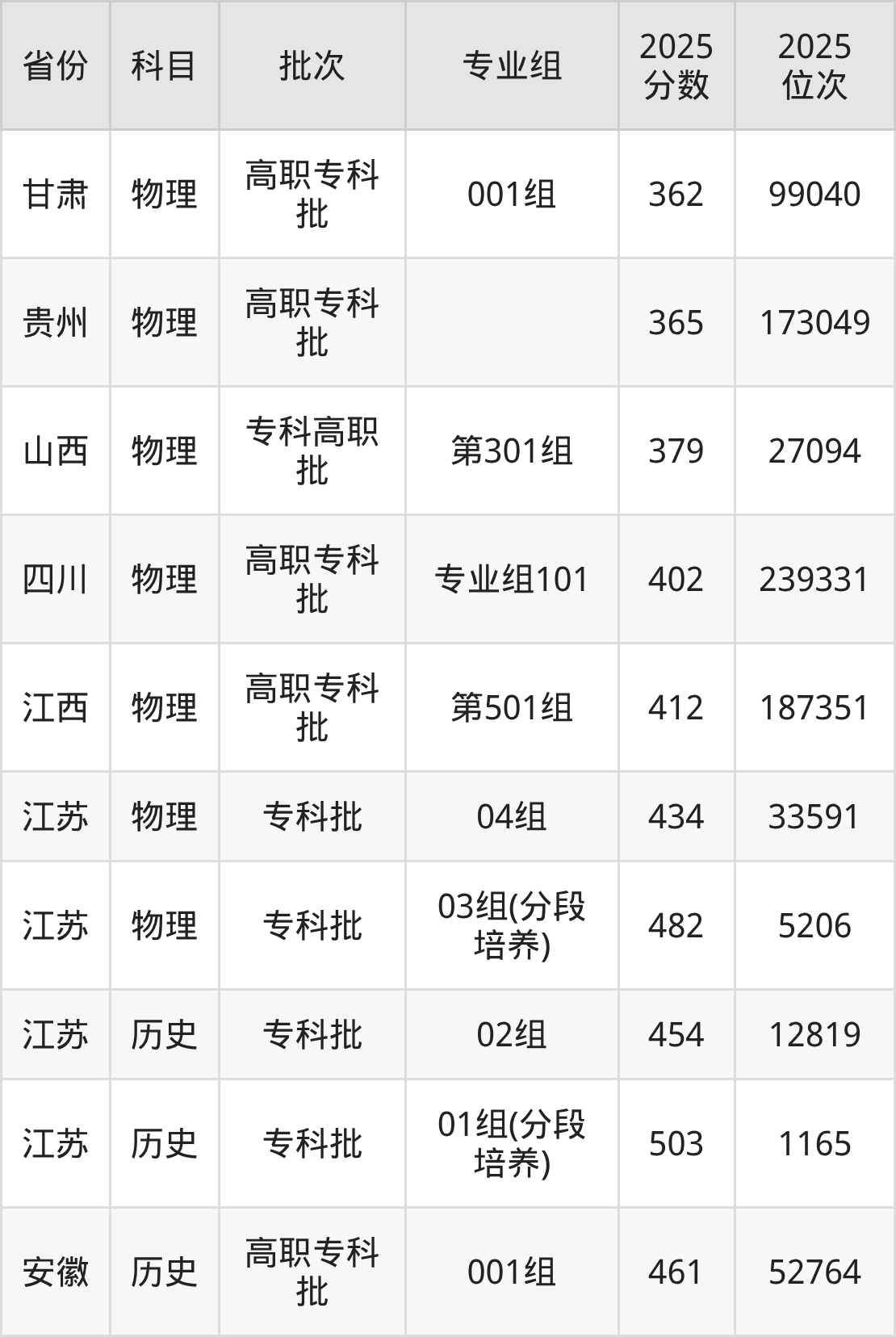 2025年在专科物理类进行招生,各专业组分数线详情如下: