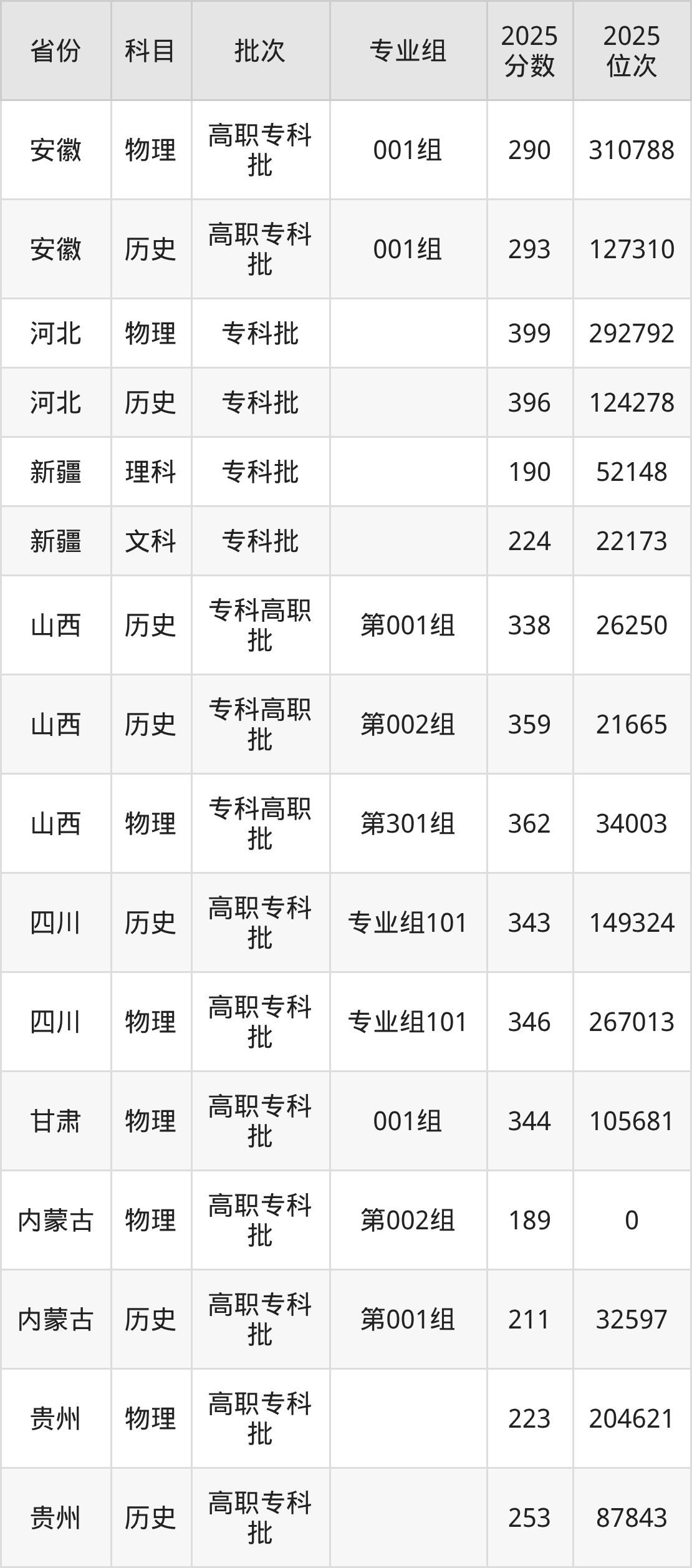 2025年在专科物理类进行招生,各专业组分数线详情如下: