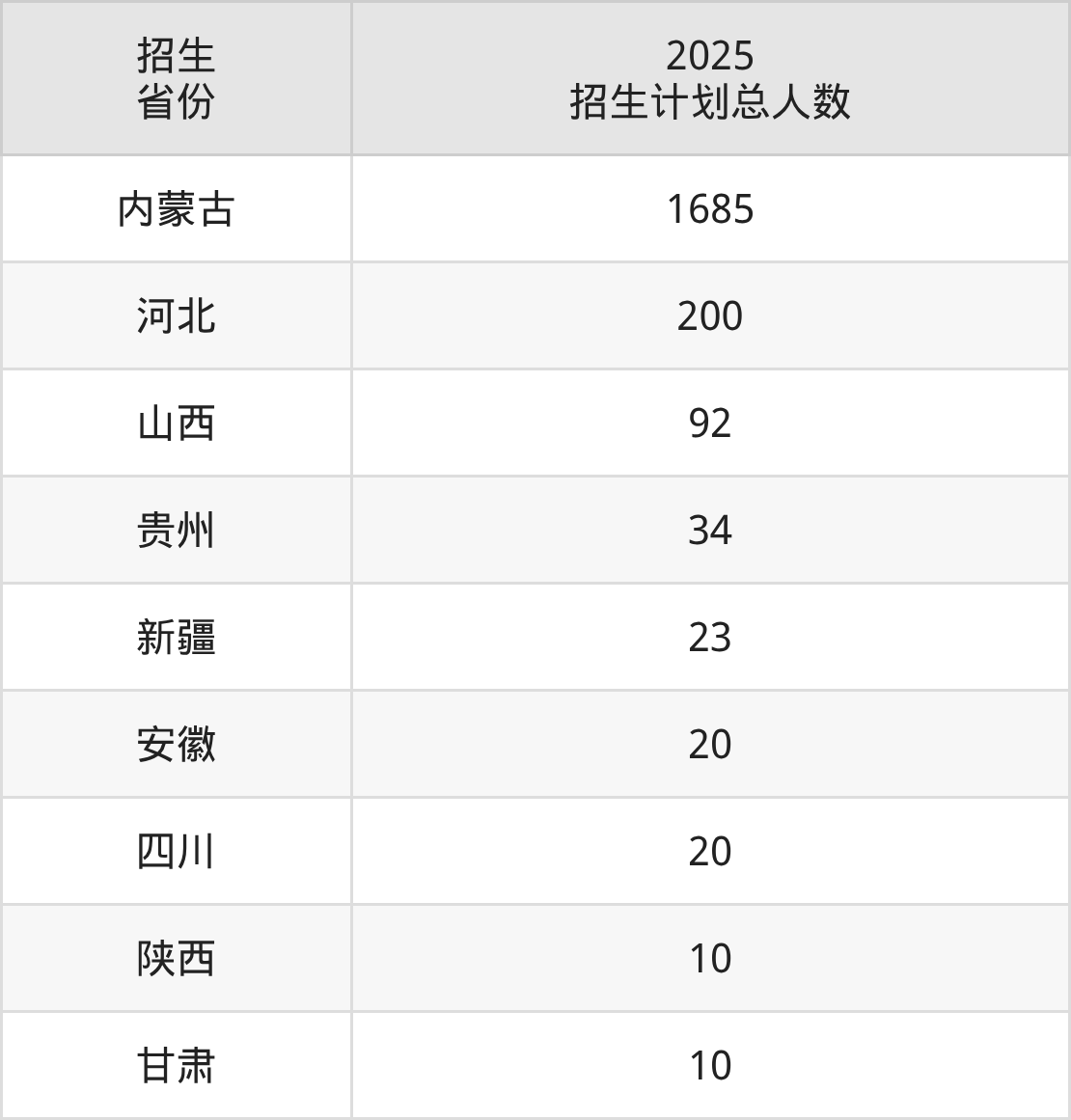 2025年包头职业技术学院面向全国9个省市开展专科招生;招生专业共33个,招生人数共2094人。2025年在内蒙古自治区招生计划总人数是1685人,其中,包头职业技术学院在内蒙古自治区招生人数最多的是智慧健康养老服务与管理。包头职业技术学院在各省具体招生人数情况如下表。