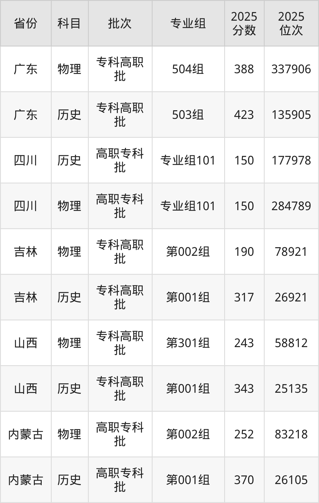 普通类专科历史类最低370分,专科物理类最低252分