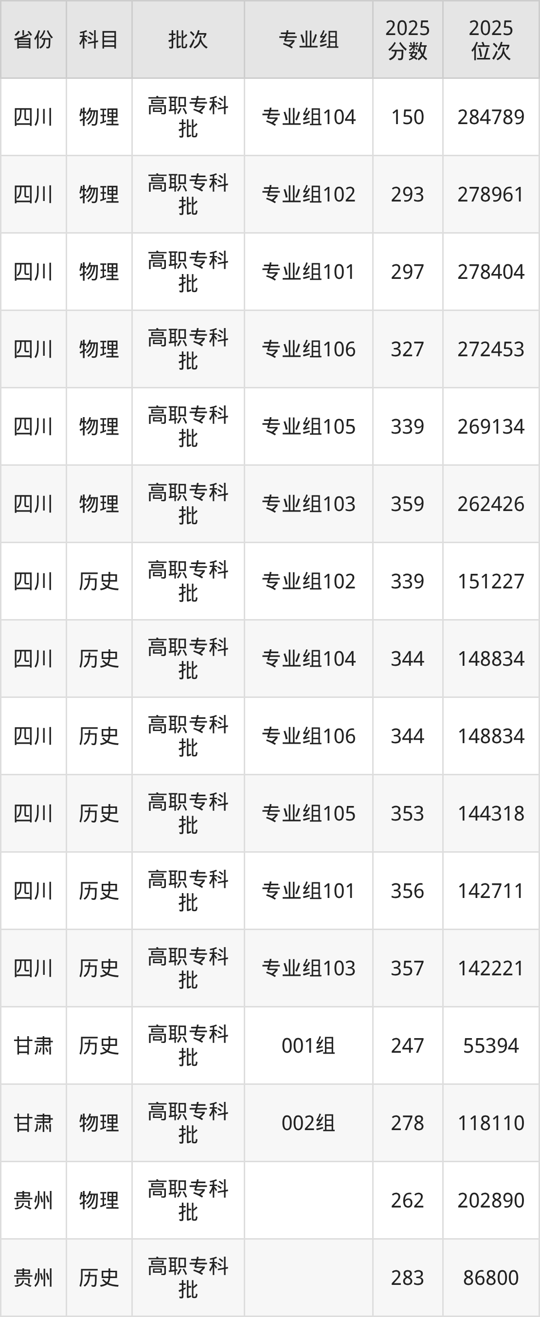 普通类专科物理类最低150分,专科历史类最低339分
